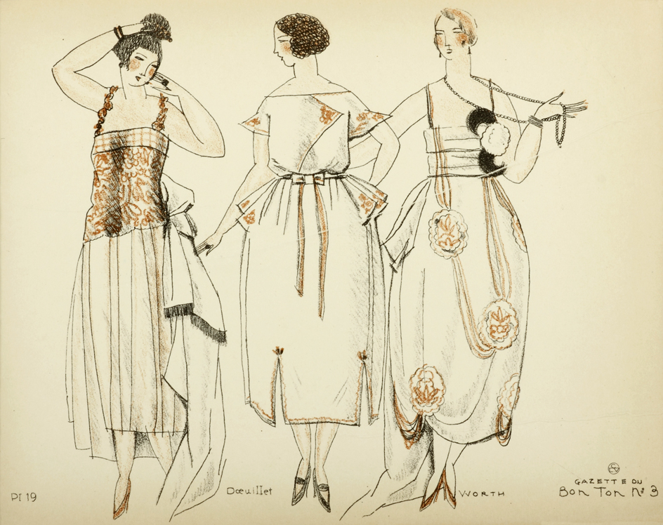 Designs by Doeuillet and Worth From “Gazette du Bon Ton”, published by Lucien Vogel and his artists all of whom were trained at the Ecole des Beaux Arts. The pochoir technique was originally employed for colouring woodblock prints in the … Read Full Description