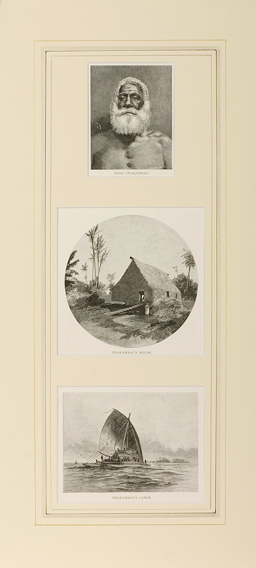 Percy Frederick Seaton Spence, 1868-1933 painter, illustrator and cartoonist, was born on 14 December 1868 at Balmain, Sydney. He was raised in Fiji. By 1888 he was back in Sydney taking lessons at the Art Society of NSW. He was a foundation member of its Sketch Club in 1888 and exhibited with it. Spence worked as an illustrator for the Daily Telegraph, the Sydney Mail, the Illustrated Sydney News, Queensland Punch and especially the Sydney Bulletin. He also contributed illustrations to the Town and Country Journal. Back at London in 1895, Spence joined the Chelsea Arts Club and contributed work to Black and White and The Graphic. Later he drew for the Sphere, Illustrated London News, Punch, Harpur’s Monthly, Ludgate Monthly, Pall Mall Magazine and Windsor Magazine. Spence and family returned to Sydney in 1905-6. His oil painting, Australian Fleet entering Sydney Harbour 1913, was purchased for the Royal collection. Like Tom Roberts, Spence served with the RAMC during WWI. He died in 1933. Rare original watercolour which was used for the illustration for Australia’s biggest publishing venture, The Picturesque Atlas of Australasia. Published as an engraving in Volume 3, page 673. Included with this watercolour are three related engravings of King Thakambau of Fiji. Original oak frame. NRLLJ