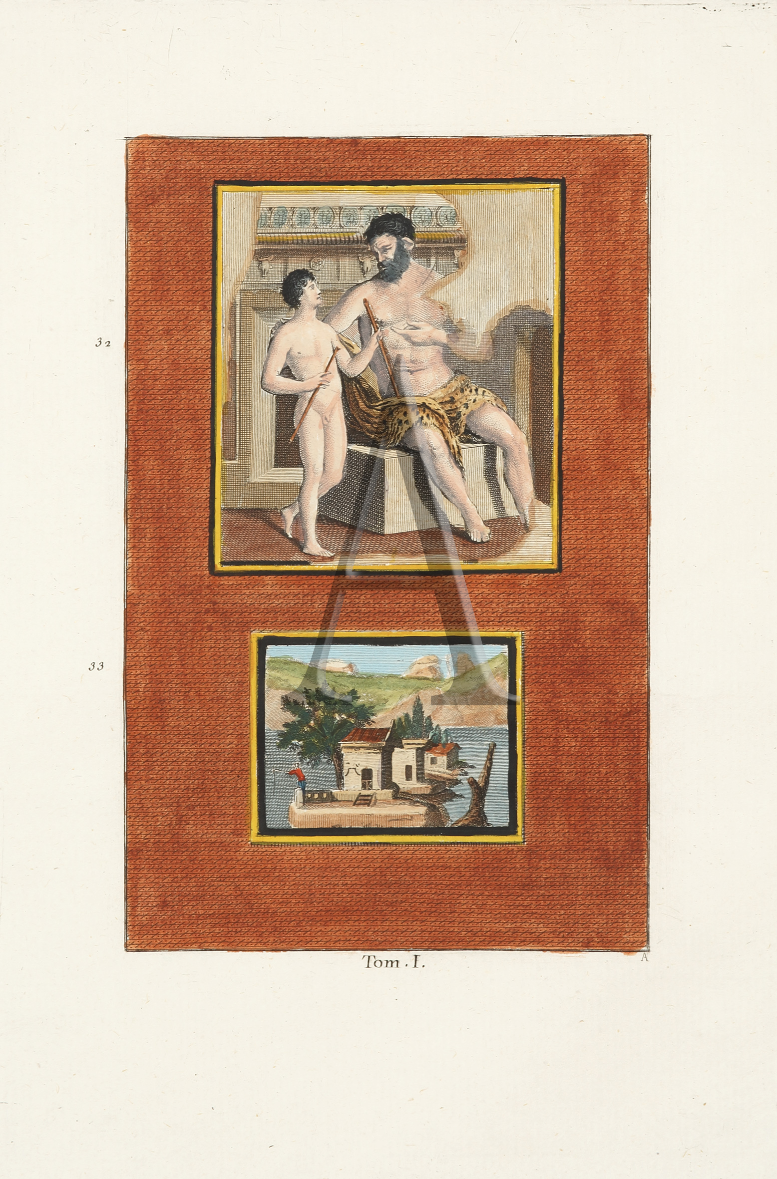 Early c.18th engraving from the series, Antiquities D’Herculanum, illustrating the most beautiful ancient paintings, and marbles, bronzes and furniture found in excavations of Herculaneum and Stabia Pompe. The discovery in 1738 and 1748 of the ruins of Herculaneum and Pompeii gave new impetus to the study of archeology.