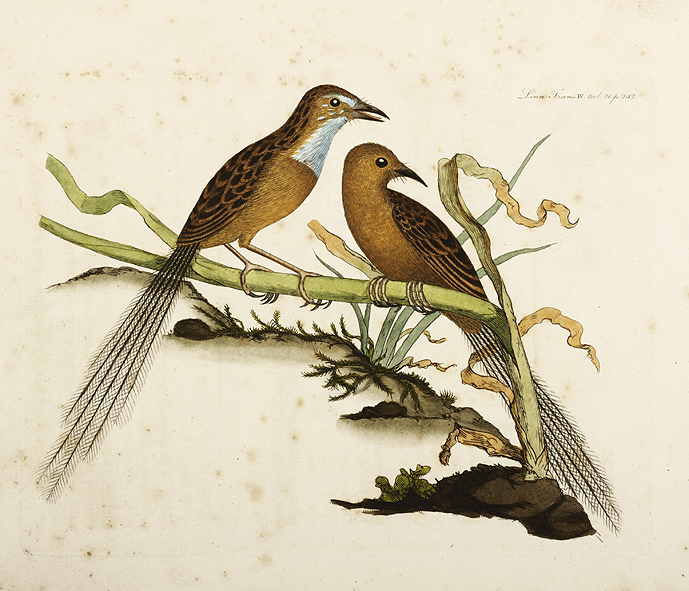 The first known illustration of the southern emu-wren. Information for this bird from New South Wales (‘Sidney and Botany-Bay’), was presented to the Linnean Society on February 6th, 1798, by Major-General Thomas Davies, from information previously supplied by Governor Phillip. … Read Full Description