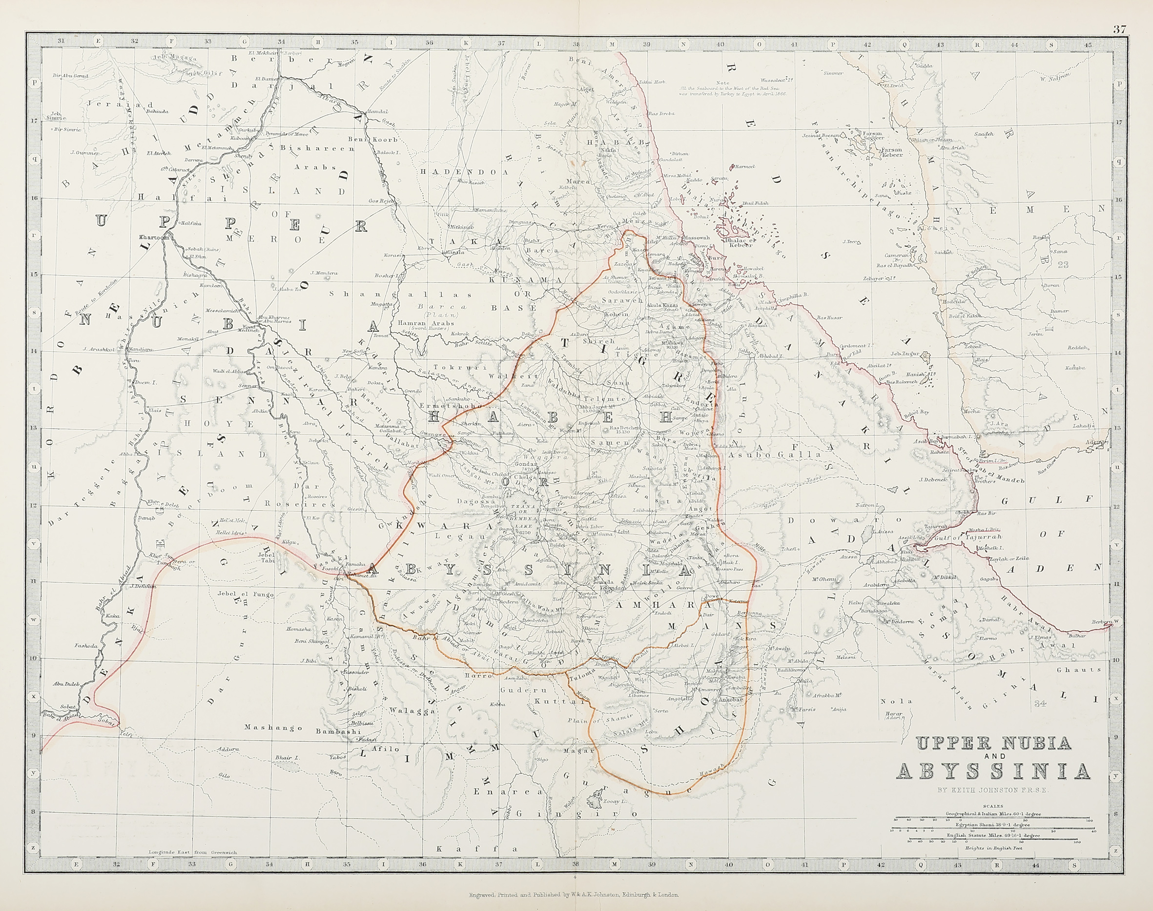 Detailed, large scale c.19th map covering the north west part of Africa which includes the Sudan, South Sudan, Eritrea, Ethiopia and Djibouti by Alexander Keith Johnston (1804 – 1871). From: Johnston, Handy Royal Atlas of Modern Geography, exhibiting the Present Condition … Read Full Description