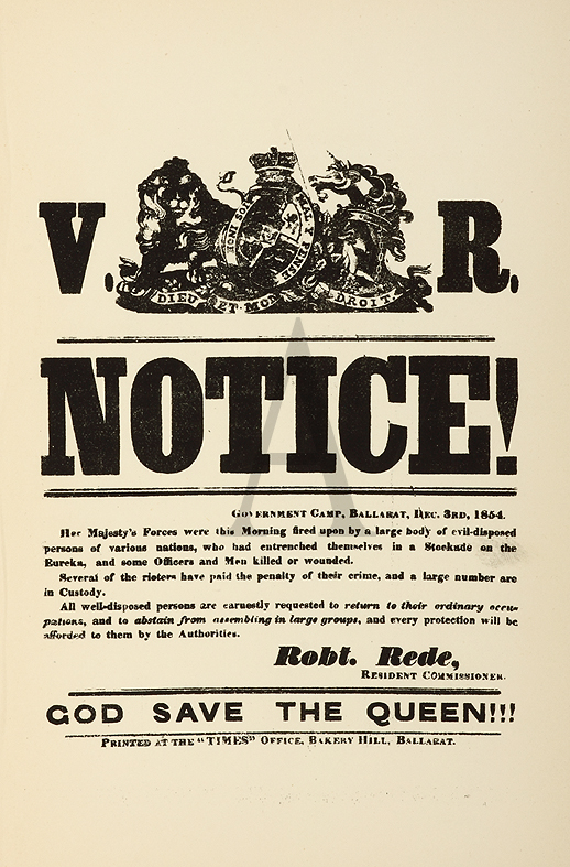 Scarce lithograph of a hand bill printed in 1887 that was first issued in 1854 during the Eureka Stockade era. References: Ferguson, J. A. Bibliography of Australia Volumes 1-8, Canberra 1976 18716. Collections: National Library Australia: Bib ID 632842 State … Read Full Description