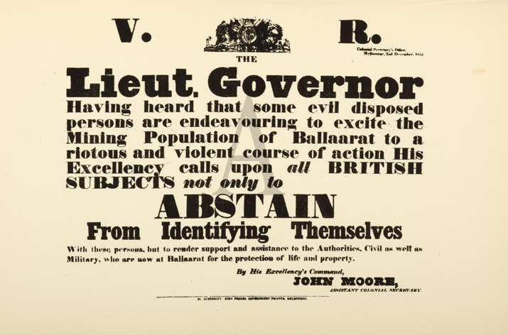 Having Heard that some evil disposed persons are endeavouring to excite the .Mining Population of Ballaarat to a riotous and violent course of action His Excellency calls upon all British Subjects not only to ABSTAIN from Identify Themselves With these; persons, but to render support and assistance to the Authorities, Civil as well as Military, who are now at Ballaarat for the protection of life and property.