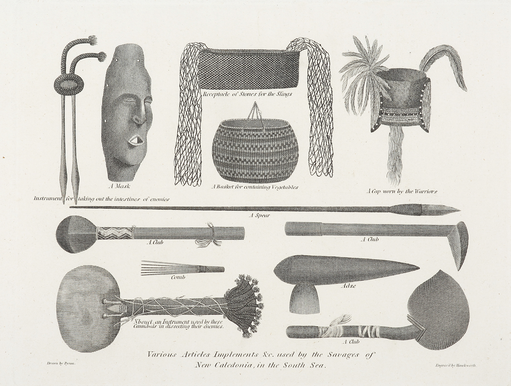 Scarce early c.19th engraving depicting Various Articles Implements used by the Savages of New Caledonia.