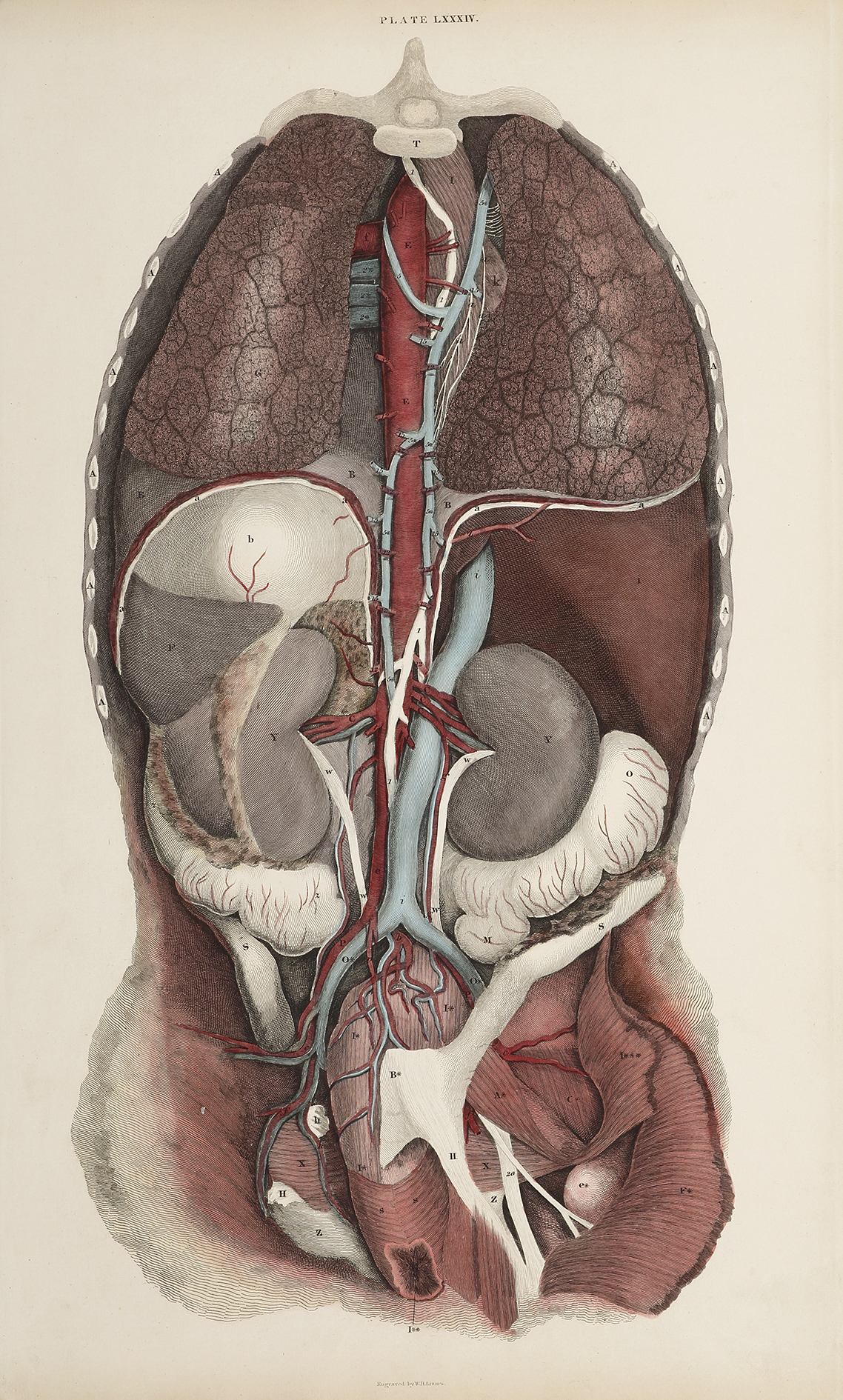[VASCULAR] Dissection of the thorax, abdomen and pelvis - Antique Print from 1826
