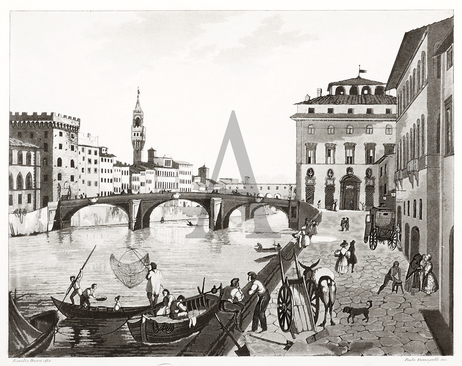 Superb aquatint view of the Saint Trinita Bridge, Florence, published by Luigi Bardi and intended for tourists, many of which were on a ‘Grand Tour’.