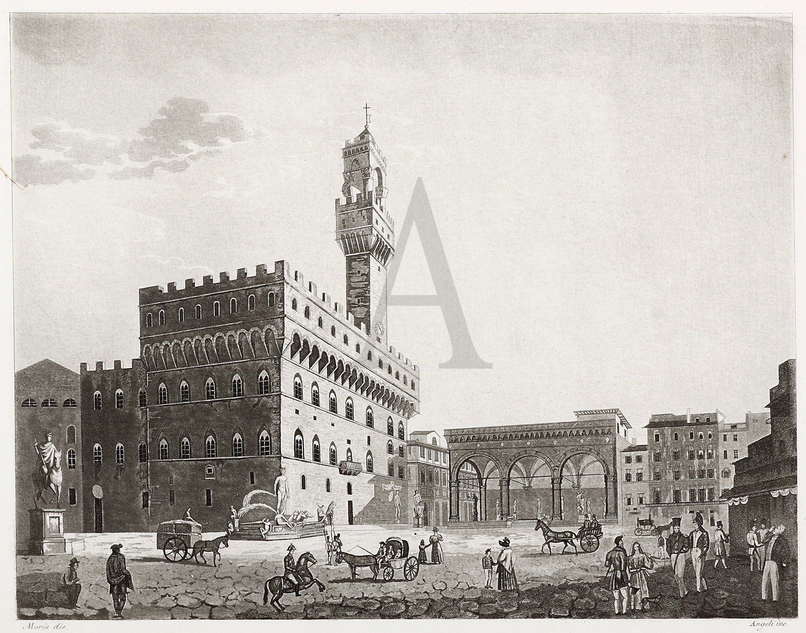 Superb aquatint view of Palazzo Vecchio and part of Piazza della Signoria, Florence, published by Luigi Bardi .