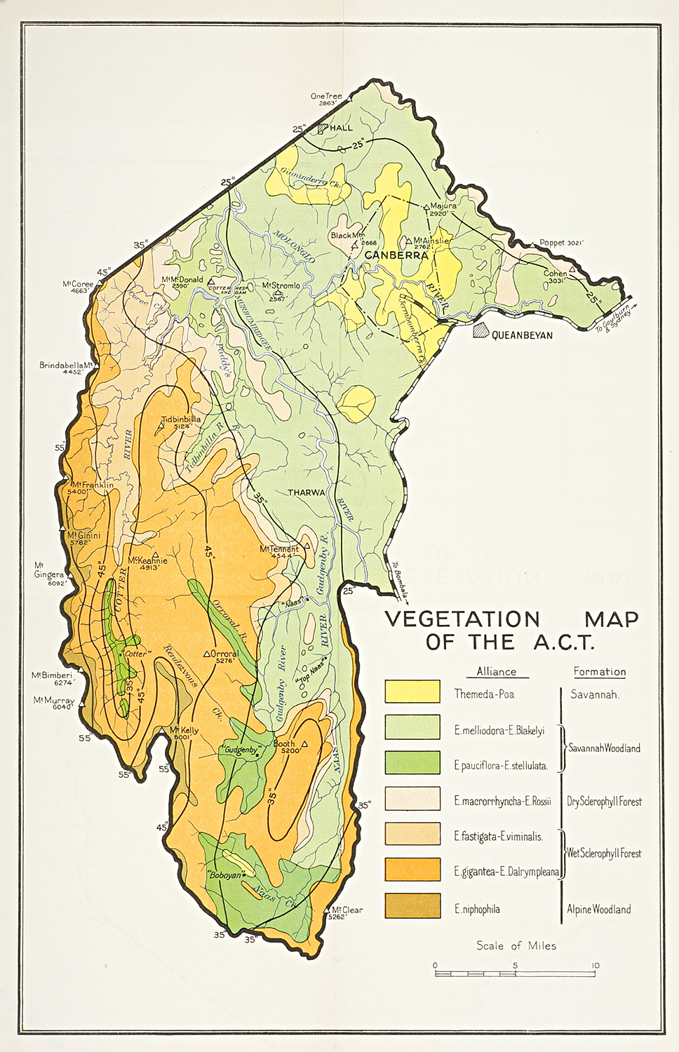 Map of the vegetation of Canberra with a colour key at lower right. The field work for this map as stated below the title was by L.D.Pyror and assisted by Forester. In 1935 John Rogers (1898-1971), a surveyor joined the … Read Full Description
