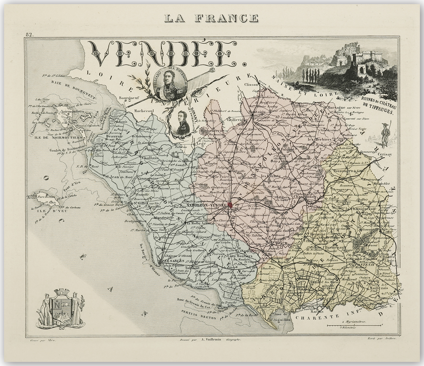 Decorative C19th map of Vendee with numerous vignettes including a view of the ruins of Chateau de Tiffauges.