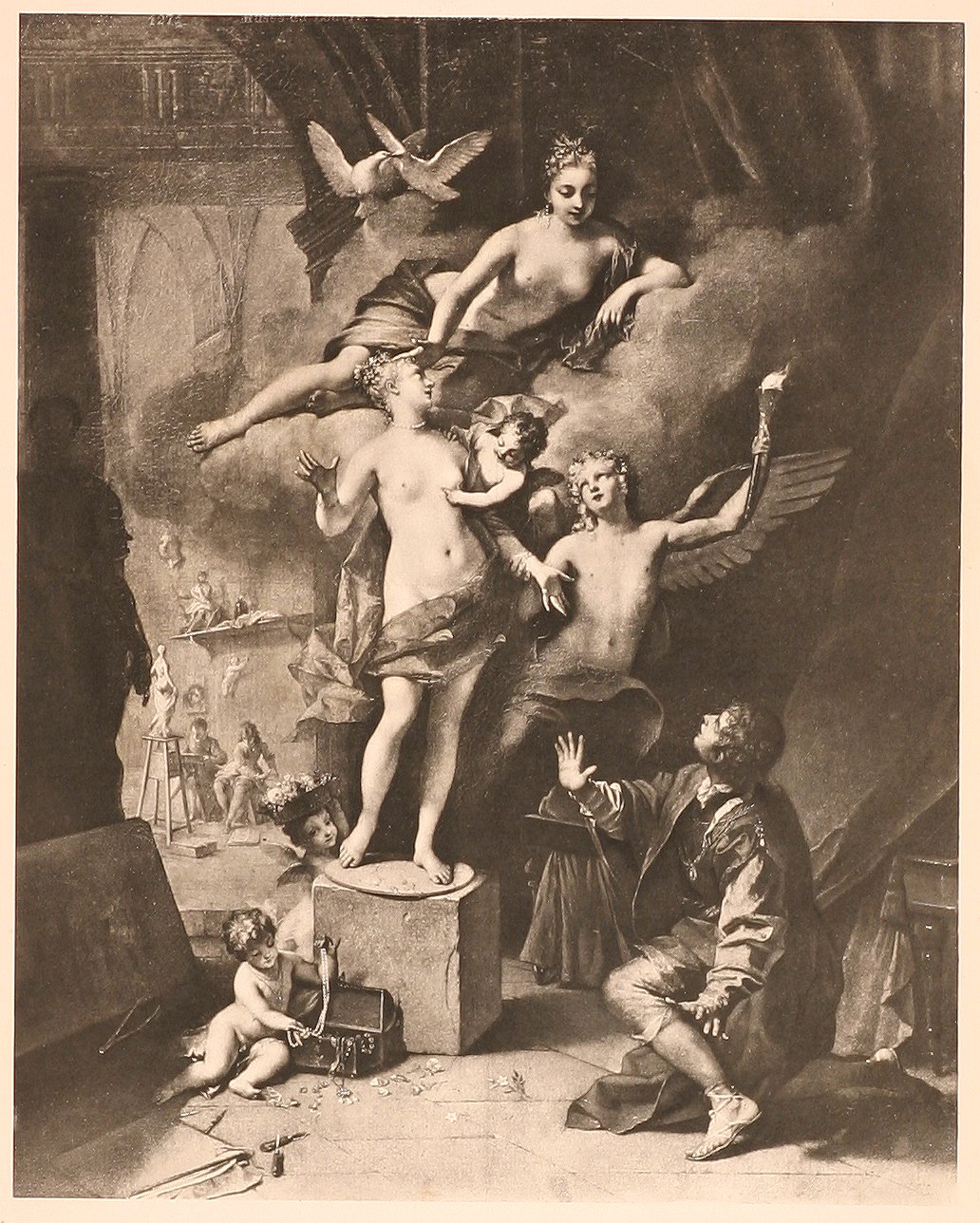 Scarce photogravuer of Pygmalion a young sculptor from Cyprus. He was a misogynist and scorned the company of women,instead he devoted his time, ironically enough, to a statue of a woman he named Galatea. He worked so long and with such inspiration on this statue, that it became more beautiful than any maiden that had ever lived or been carved in stone.