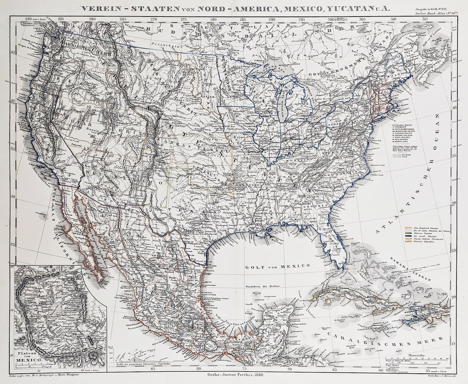 Very detailed German c.19th map of America with an inset of Mexico. Although dated 1860 at bottom this map was printed in 1862 in the 3rd edition of Stielers Handatlas. Collections: Library of Congress: LC control no. n 88080340 National Library … Read Full Description
