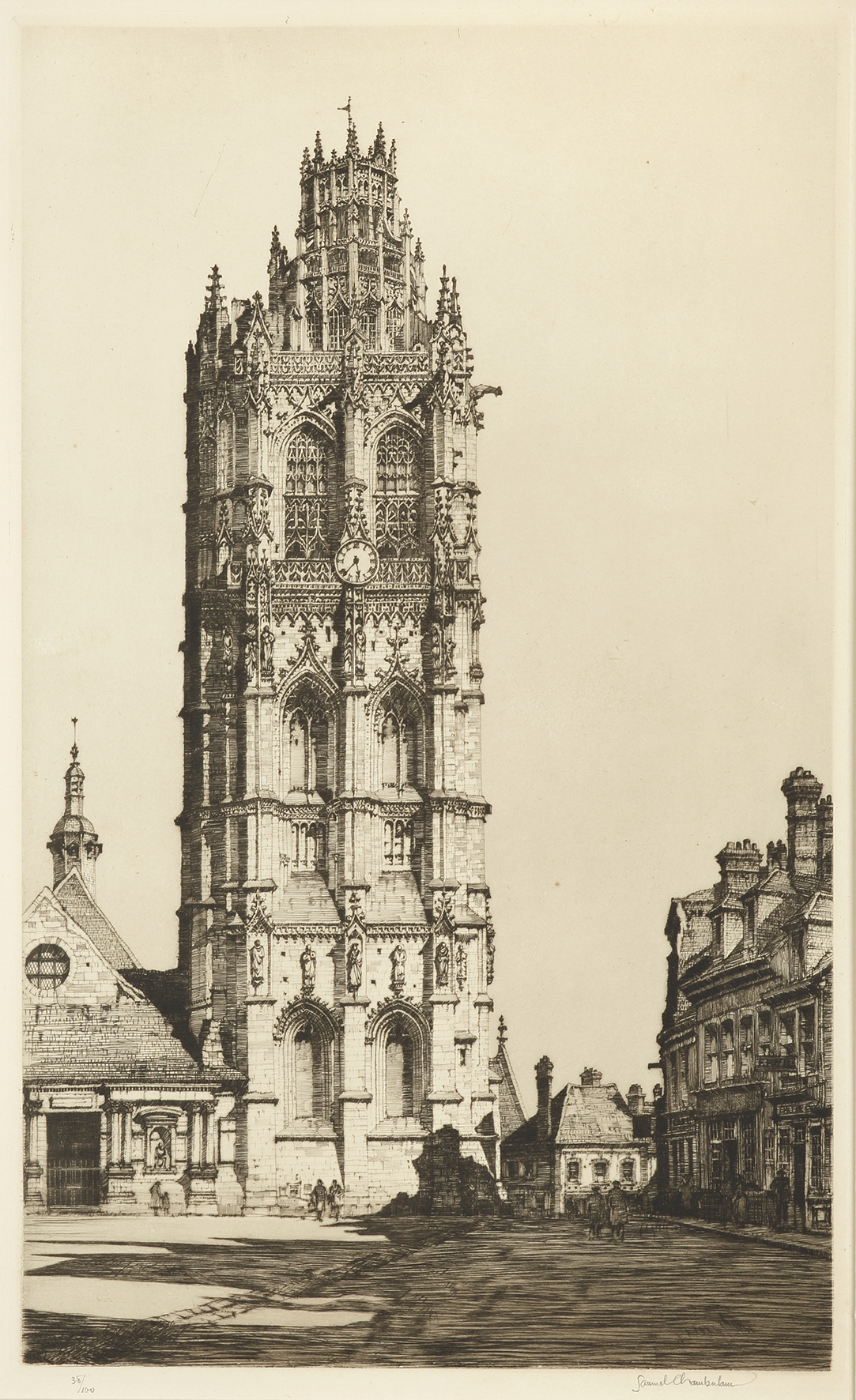 Fine etching of Verneuil-sur-Avre Cathedral in Normandy by Samuel Chamberlain numbered 38 of 100 and signed in pencil lower right.
