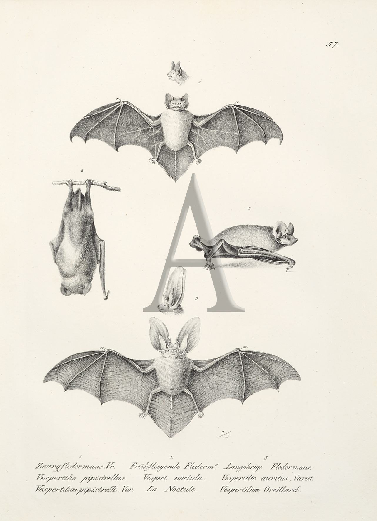 Vespertilio pipistrellus. Vespert noctula. Vespertilio auritus, Variet. (Bats)