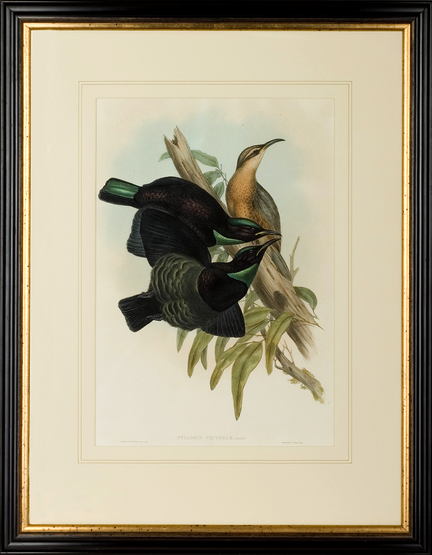 Gould was born in 1804, at Lyme Regis in Dorset. In 1818 his father was appointed a foreman gardener at the Royal Gardens, Windsor Castle. As a youth Gould also trained at these gardens and became an expert in taxidermy. In 1825 Gould moved to London and set himself up as a self-employed taxidermist. He was the first known taxidermist to have received royal patronage after preserving a Thick-kneed Bustard for King George IV. Numerous orders followed from the king with the most arduous task being stuffing the famous giraffe given by the Pasha of Egypt. He met and married Elizabeth Coxen in 1827. A talented artist in her own right, Elizabeth’s drawings and lithographic skills were fundamental to the success of John Gould’s renowned publications. In 1830, he obtained a number of specimens of the exotic and little-known birds of Northern India, forming the bold idea of issuing a book about them, which was rejected by the publishers. Gould was determined to issue the book himself at his own expense and so he arranged for his talented wife to draw and lithograph the plates form his own sketches. He persuaded N.A. Vigors to write the text for him and then set about getting subscribers for his publication. At this, he was spectacularly successful and this list was headed by Victoria (Queen from 1837) and Prince Albert, an emperor, a king, three princes and nine dukes. The resulting book, A Century of Birds… from the Himalaya Mountains, was published in 1832. This folio size (550mm x 380mm) was to become his format for all his great works. Encouraged by the response to his first book, Gould set about on a more ambitious project: an attempt to illustrate all of the birds of Europe. He engaged Edward Lear to share the job of illustrating the work with Elizabeth and between them they produced 449 plates for the Birds of Europe which was completed in 1837. This established Gould not only in the eyes of the public but also within the scientific community. He then sailed to Australia in May 1838 with his wife and eldest son, aged 7, a young nephew, a man-servant and a maid-servant, and his collector John Gilbert. He stayed in Australia for two years leaving from Sydney on 9 April 1840. On his return he took on his greatest work, The Birds of Australia begun in London on 1 December 1840. The final parts, making a total of thirty-six, appeared in 1848. They were bound in seven volumes and the cost to subscribers was £115. A supplement volume issued in parts was completed in 1869. The Birds of New Guinea and the Adjacent Papuan Islands, Gould’s last great work, was completed after his death by Richard Bowdler Sharpe. Gould prepared the first twelve of the 25 original parts of the work, while Sharpe, Gould’s protégé and devoted friend, was responsible for the remainder of the monograph. Sharpe was more than forty years junior to Gould, whom he had met when he was only fifteen, and they both shared a passionate interest in ornithology. In his last years, although an invalid and often in pain, Gould was always pleased when Sharpe visited him to look at his collection of skins and discuss the latest bird discoveries. No other ornithologist can claim to have discovered and illustrated faithfully so many species of birds. The Birds of New Guinea are a fitting tribute to a long and prolific life in the field or ornithology. They are a magnificent record of the exotic world that John Gould so dearly loved, not only for the scientific value but also for his love of nature.