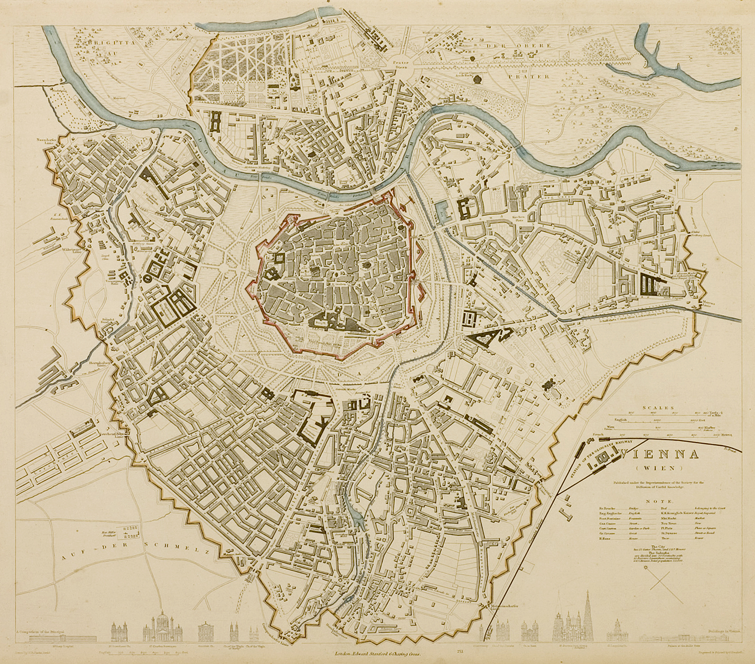 Detailed plan of Vienna with engraved elevations of prominent buldings along the lower section of the map. Published by the Society for the Diffusion of Useful Knowledge.