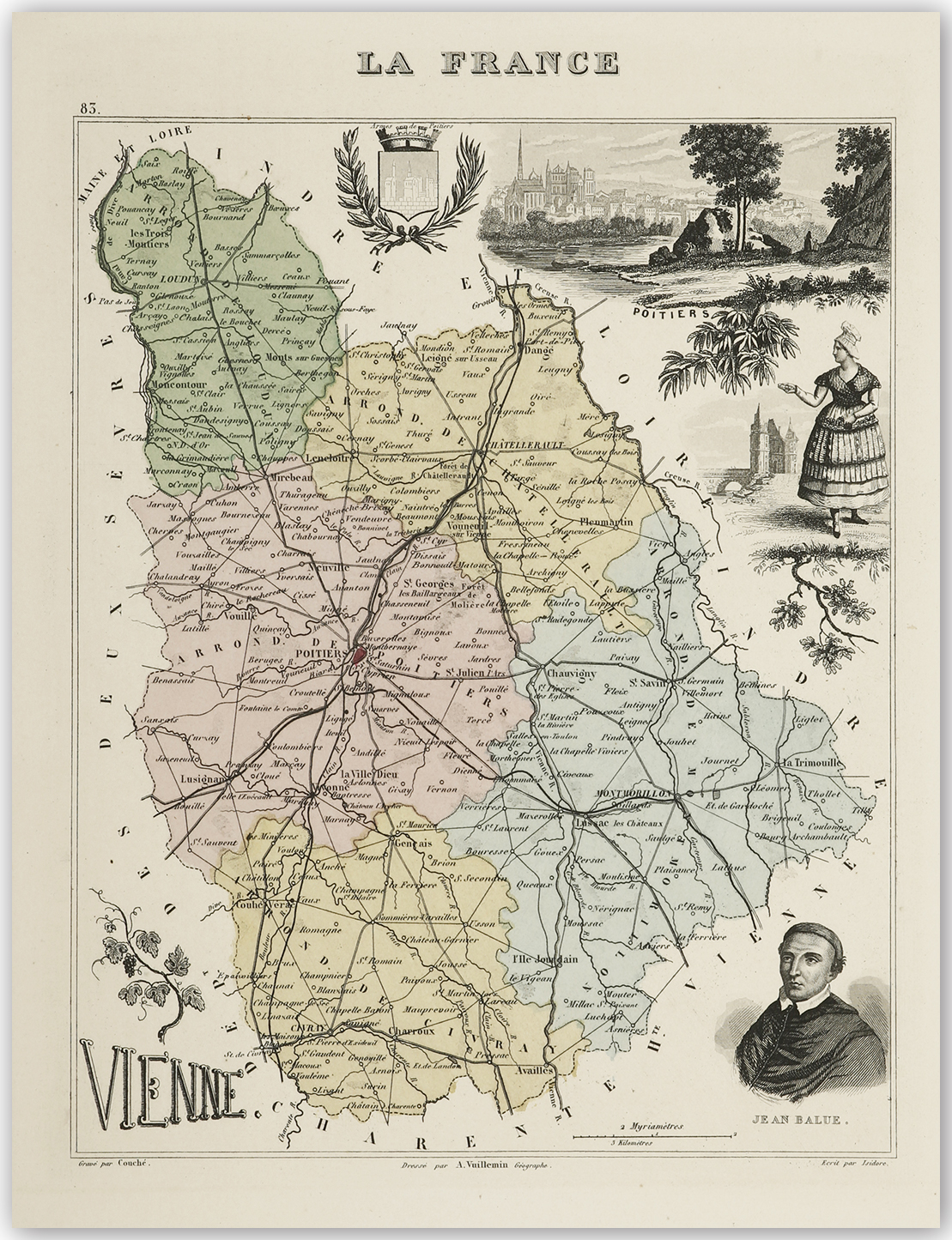 Decorative C19th map of Vienne with numerous vignettes including a view of Poitiers and a portrait of Jean Balue, French cardinal and minister of Louis XI.
