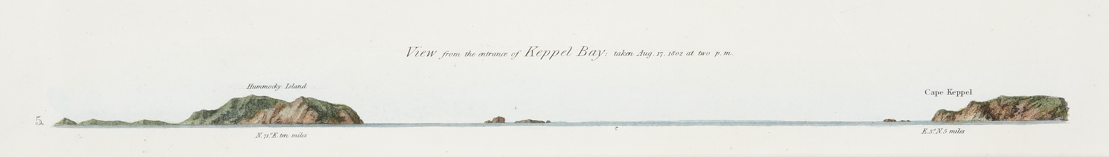 The anchor was weighed at daylight of the 17th, but the wind and tide being unfavourable, it took the whole day to get into the offing; at dusk we came to, in 9 fathoms, mud and sand, having the centre of the hummocky island bearing S. 72° E. two leagues. A sketch of the island and of Cape Keppel was taken by Mr. Westall the image taken whilst beating out of the bay.