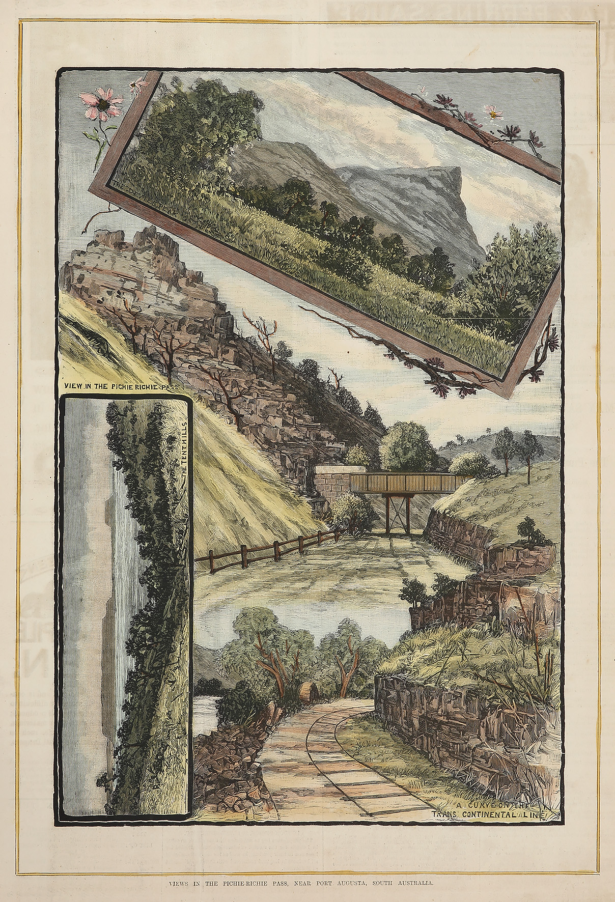 Scarce c.19th hand coloured engraving of Pichie Richie Pass, South Australia. Subtitles: The Devil’s Peak, View in the Pichie-Richie Pass, Trans Continental line, The tent hills. From the original edition of the Australasian Sketcher. Collections: National Library Australia: Bib ID 914558 … Read Full Description