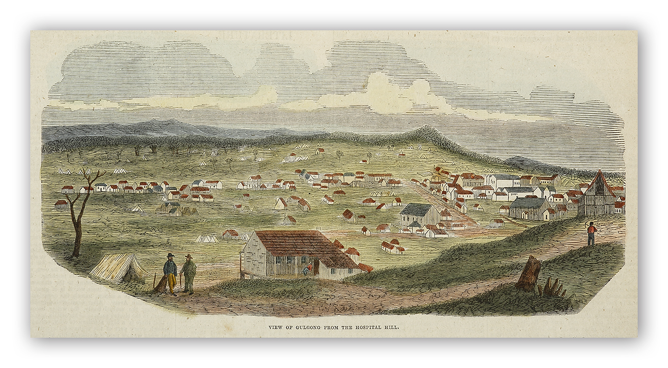 Very rare early engraved view of Gulgong soon after the discovery of gold at Red Hill in 1870. The township was surveyed in August 1870. By the end of that year there were 800 people on the diggings, which yielded over 32 tons of gold in the 1870s. The population had increased to 12,000 by the time the British author Anthony Trollope visited in October 1871.