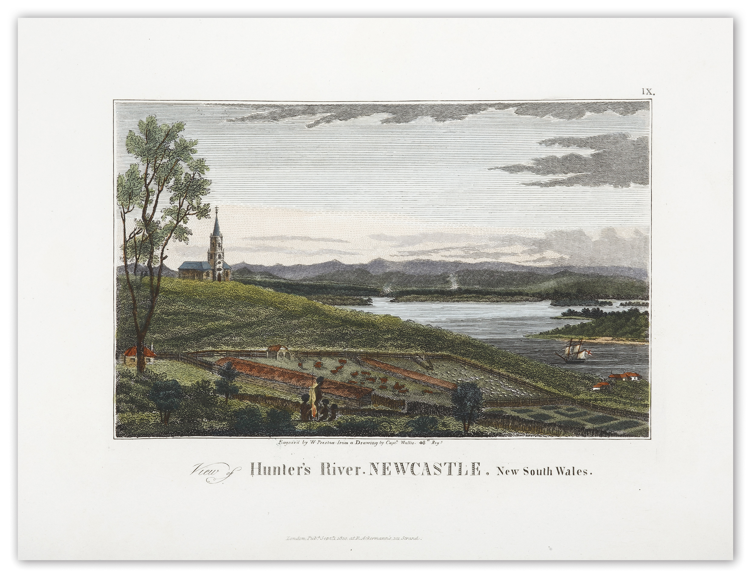 Rare early c.19th View looking towards the original Christchurch, up the Hunter River by Captain James Wallis.
