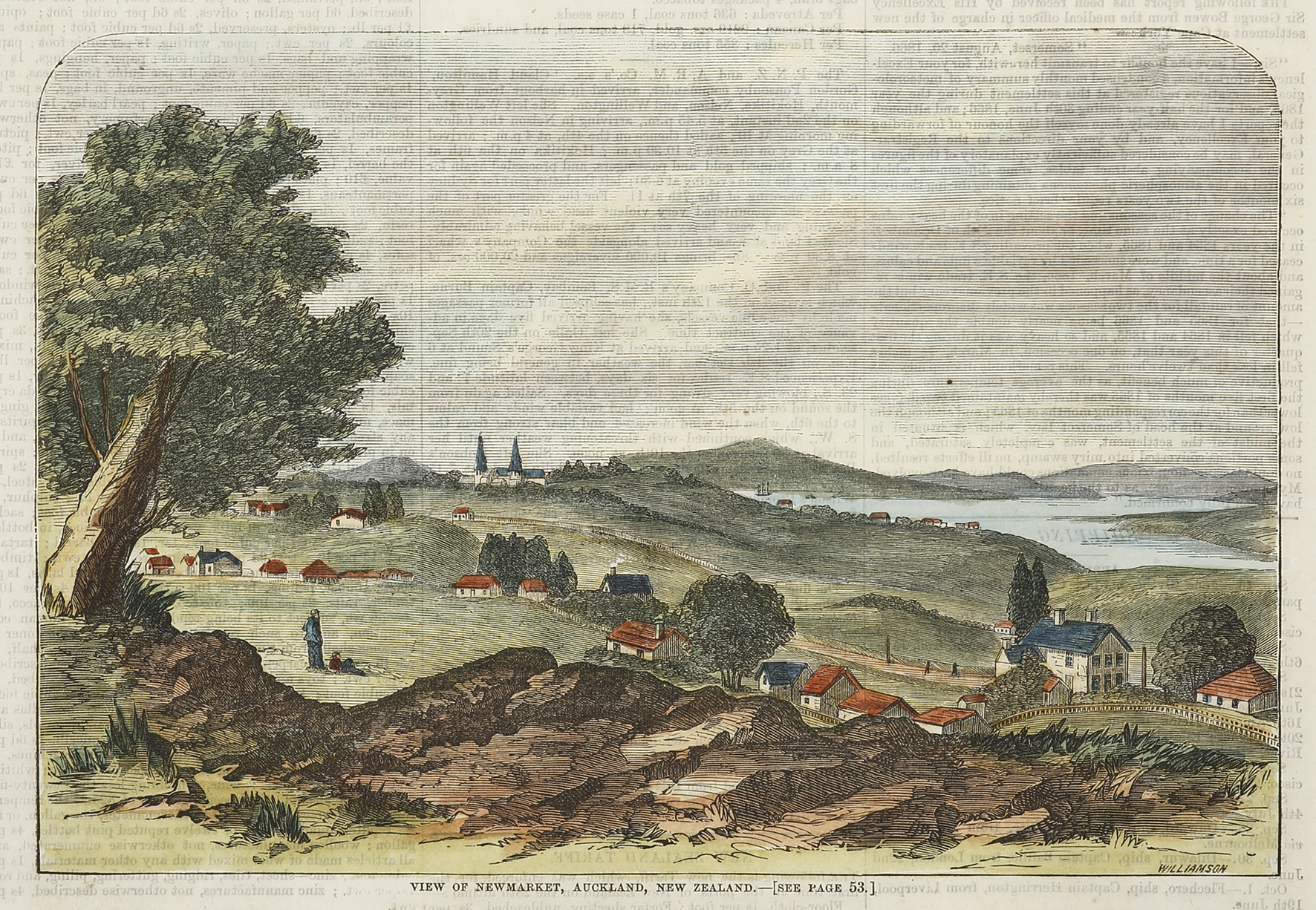 Rare and early colonial engraving of Newmarket, Auckland taken from a watercolour by John Barr Clark Hoyte (1853-1913). The extensive view is looking over Newmarket and Parnell, with a large tree in the left foreground, houses, streets, churches, the harbour and Rangitoto. The left-hand spired building is St. Mary’s Church, built 1860, that on the right is Bishopscourt, St. Stephens Ave., Parnell. The house to the right of Bishopscourt is the “Master’s House” of the Church of England Grammar School. (Kinder’s house). Reference: National Library Wellington; Ref C-052-006