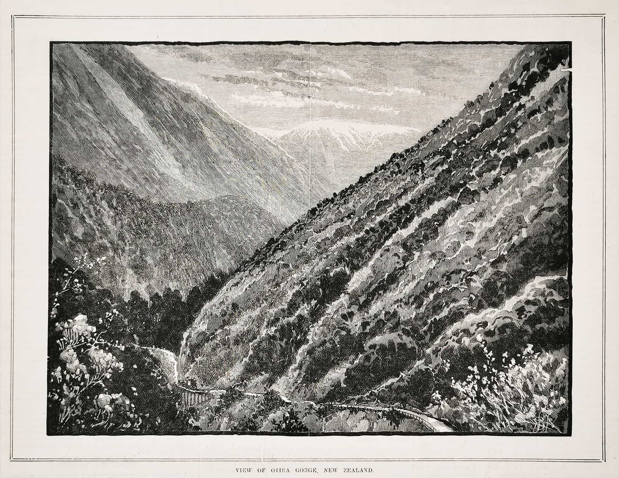 Engraving of Otira Gorge, South Island, New Zealand. From the original edition of the Australasian Sketcher.