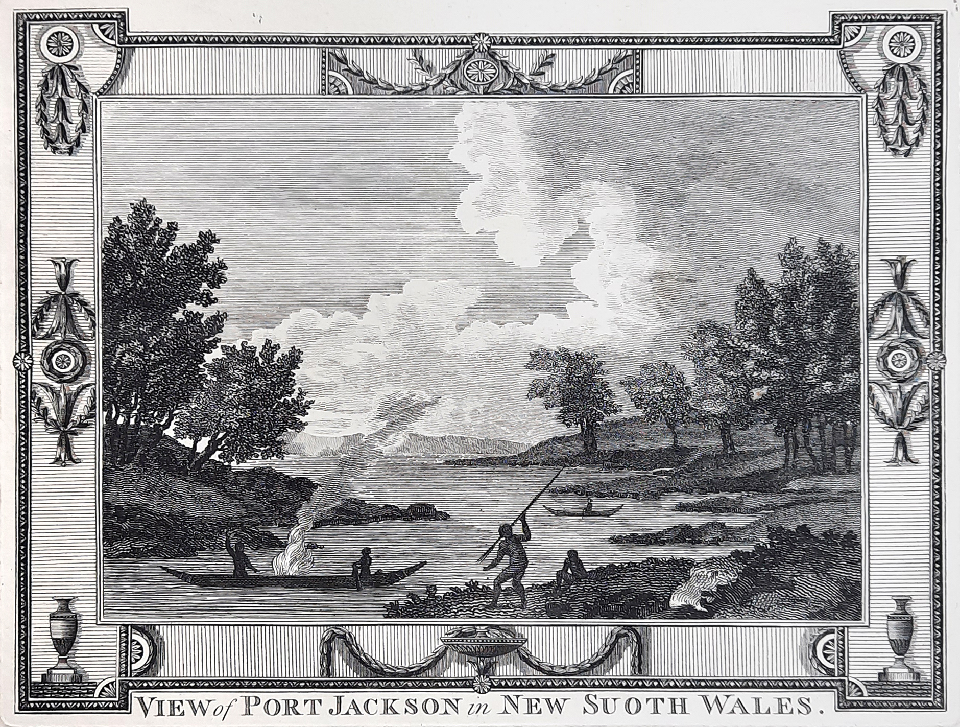 This image was first issued in a smaller format without the elaborate border design in 1790, on the title page of John White’s, ‘Journal of a Voyage to new South Wales’, titled ‘View in Port Jackson‘. It was later copied and issued in John Hamilton Moore’s, ‘A New and Complete Collection of Voyages and Travels, with the title changed to, ‘A View in Port Jackson, New South Wales‘, in 1793.