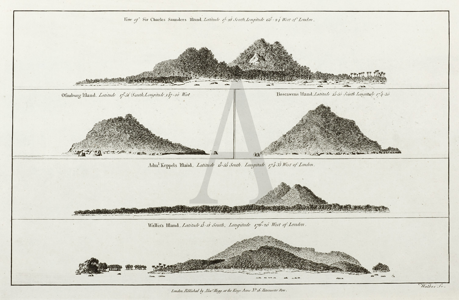 Coastal profiles of five islands in or adjacent to the Tonga Islands group which Wallis explored in the Dolphin, from 28th July 1767; 1. Sir Charles Saunders Island [Maiao] in the Windward Islands of the Society Islands 2. Osnaburg Island [Mehetia] … Read Full Description