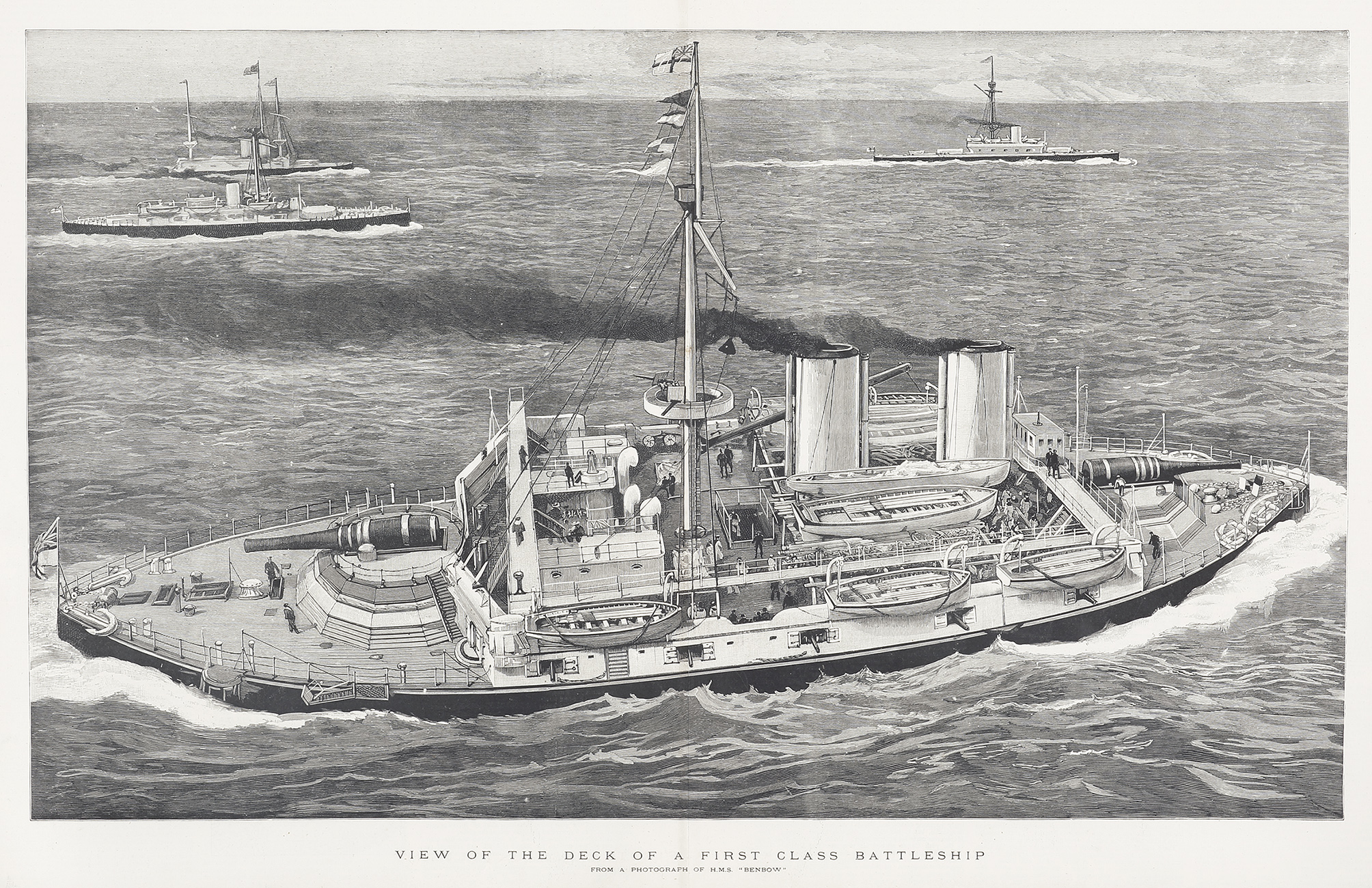Large detailed engraving of the H. M.S Benbow an Admiral-class battleship of the British Royal Navy, named for Admiral John Benbow. Completed in 1888, Benbow spent the majority of her career in reserve with only brief spurts as part of the active fleet. The battleship was scrapped in 1909.