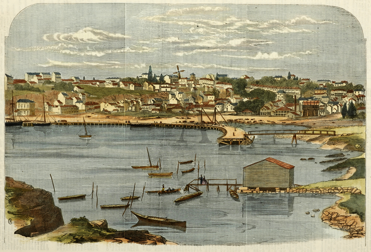 Rare easterly view of Woolloomooloo showing the construction and reclaiming of land for the wharf. At the top of the hill is a solitary surviving windmill. From the original edition of the Illustrated Sydney News.