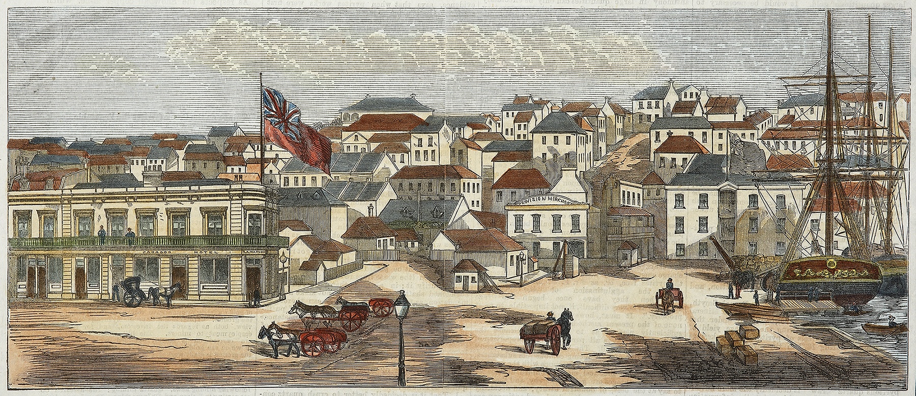 Very rare early engraving of Circular Quay, looking south with the Paragon Hotel shown on the left hand side of the view. The hotel was owned by R.A.Watson at the time.