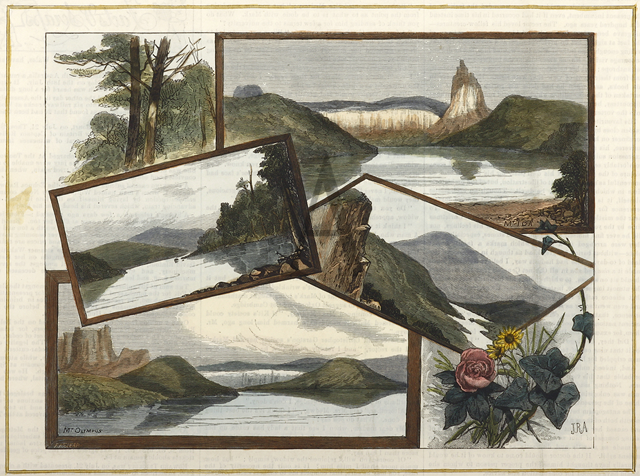 Inset titles clockwise from top right:Mt Ida, Mt. Olympus. Rare engraved view of Lake St Clair is in the Cradle Mountain-Lake St Clair National Park. From the original edition of the Australasian Sketcher.