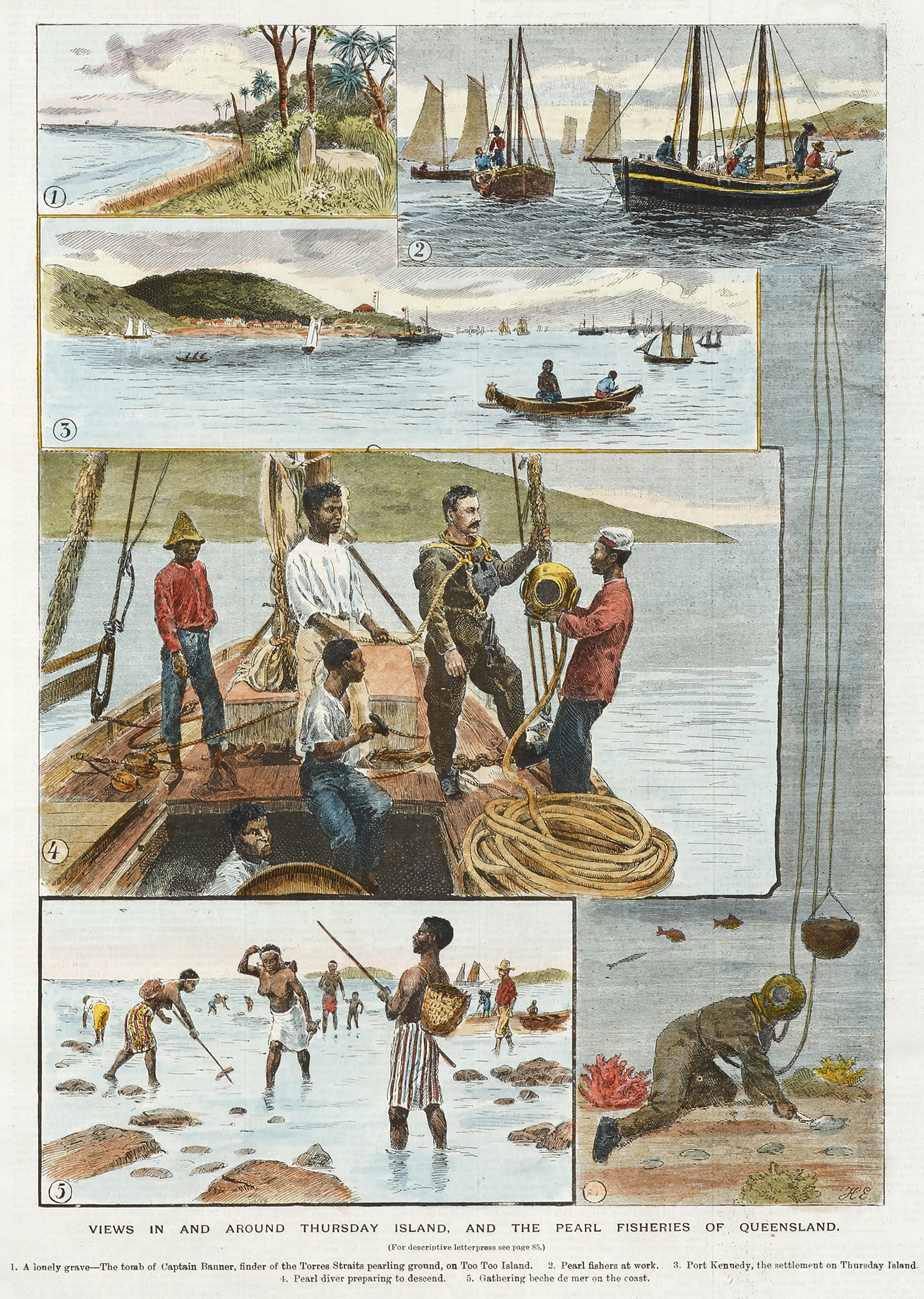 Very rare colonial engraving of Australian pearling showing helmeted divers at work from pearl lugggers.. 1. A Lonely Grave-Tomb of Captain Banner, finder of the Torres Straits pearling Ground, on Too Too Island. 2. Pearl fishers at Work 3. Port … Read Full Description