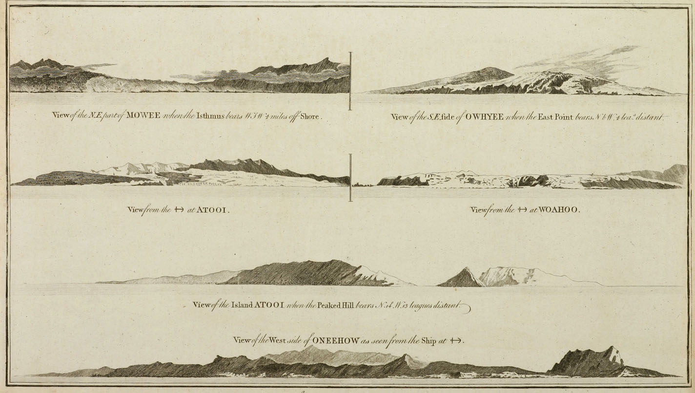 Coastal profile views of the Hawaiian Islands. From George William Anderson A New, Authentic, and Complete Account of Voyages Round the World, Undertaken and Performed by Royal Authority. Containing a New, Authentic, Entertaining, Instructive, Full and Complete History of Captain … Read Full Description