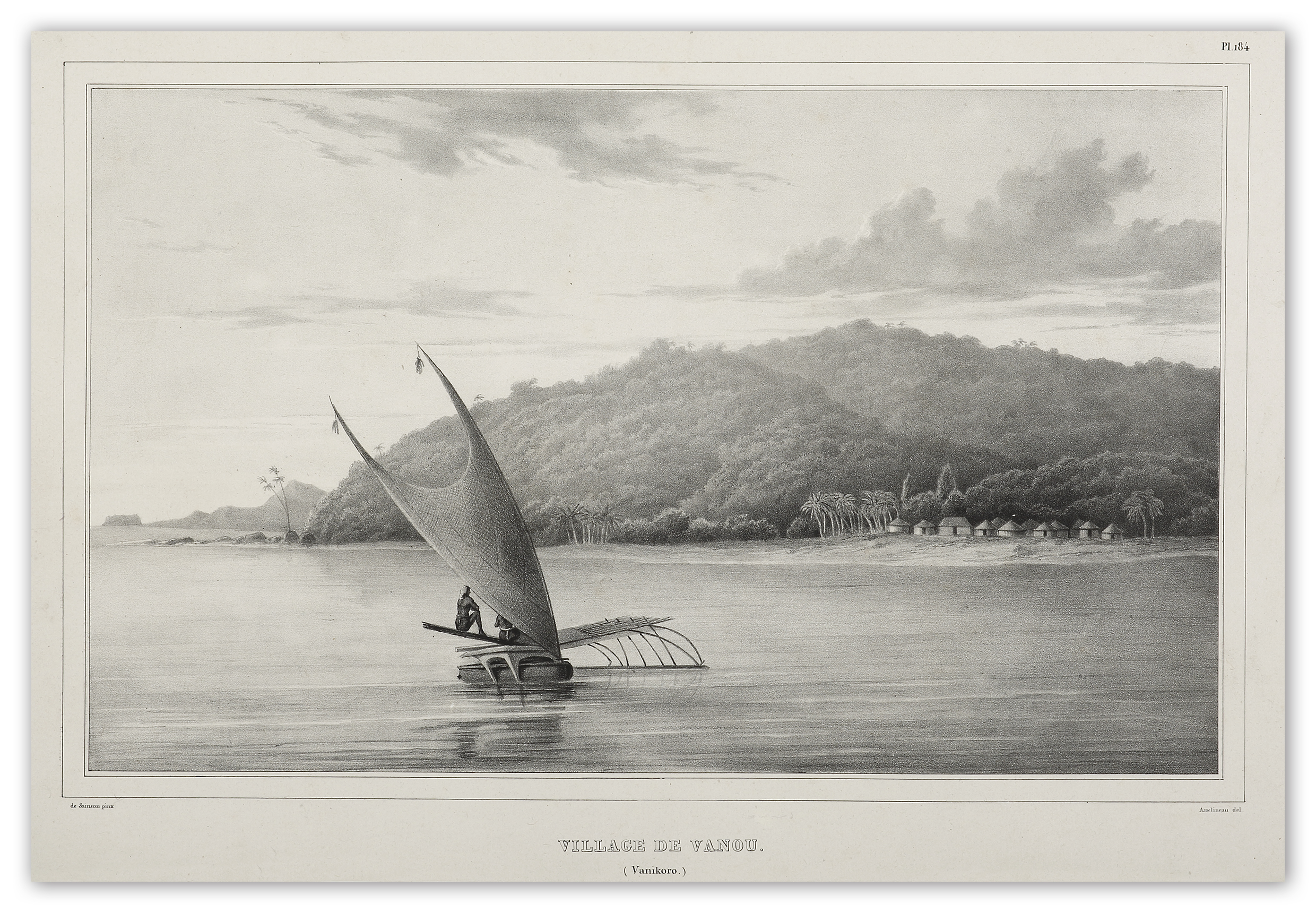 First edition of this superb Chine-collé lithograph on India paper of Vanikoro, Solomons, by Louis de Sainson was the artist aboard the famous Dumont D’Urville voyage of scientific discovery and exploration. The French explorer Jean-François de La Pérouse was stranded on Vanikoro after both his vessels, La Boussole and the Astrolabe, struck the then unknown reefs of the island in 1788. It is reported that some of the men were killed by the local inhabitants, while the surviving sailors built a smaller vessel and left the island, but were never seen again. Those that remained on the island died before Dumont D’Urville’s arrival in 1826.