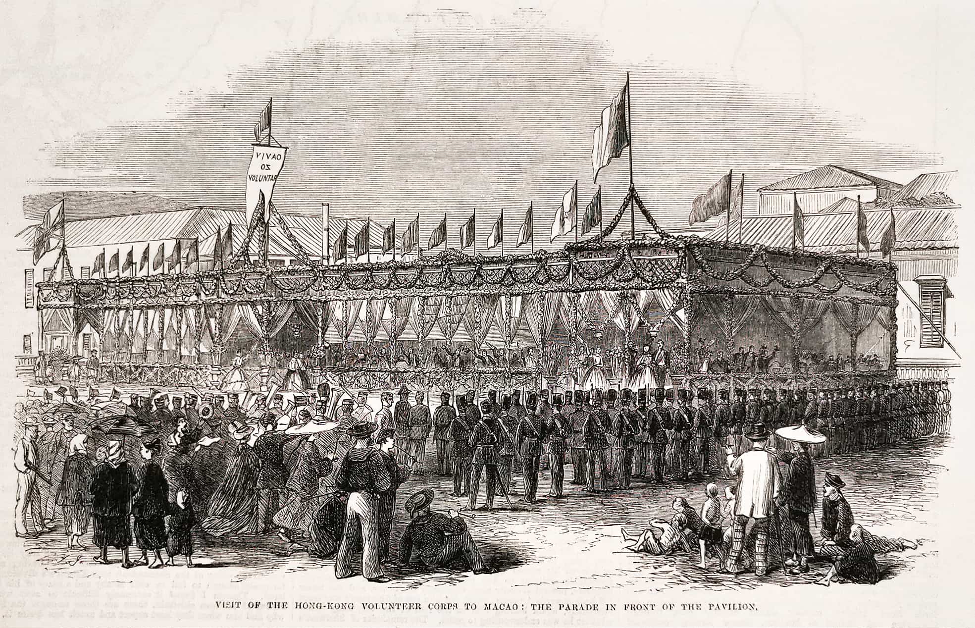 Engraving of the Hong Kong volunteer corps at Macao. From the original edition of The Illustrated London News.