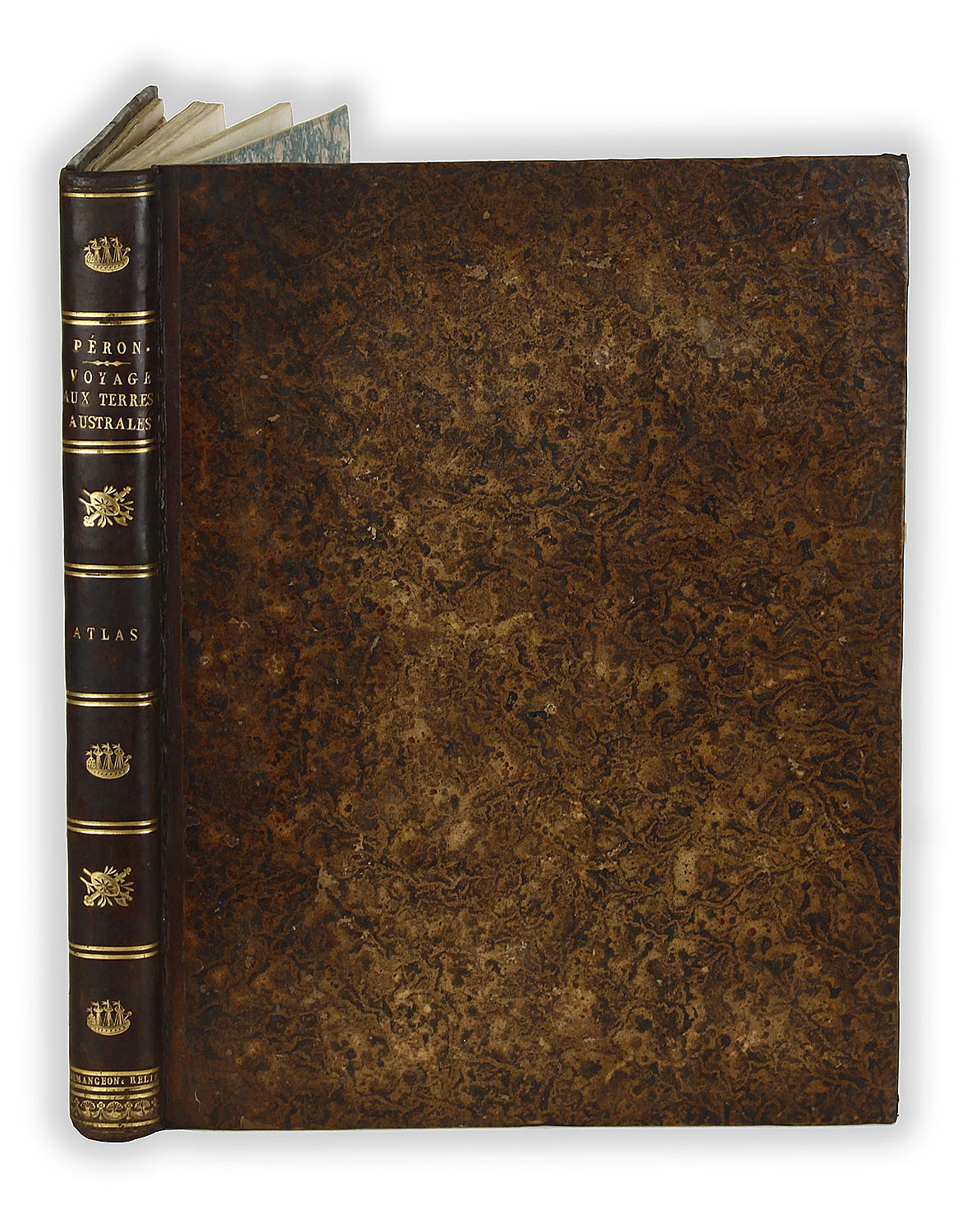 First edition, 2 volumes of text and atlas, 2 engraved titles and an engraved portrait of Peron, 2 folding tables, 40 engraved plates including, a large folding plate of Sydney, 23 hand coloured engravings and 14 maps. Minor spotting in places as usual, slight browning to text in places. The folding maps with the usual splits. Bound in contemporary half-calf , spines gilt, lightly rubbed. The magnificent plates (num. II-XLI) are of coastal profiles, the Aborigines, fauna and view. The map part, contains the first printed chart of Australia, Carte Generale de la Nouvelle Hollande by Freycinet’s.