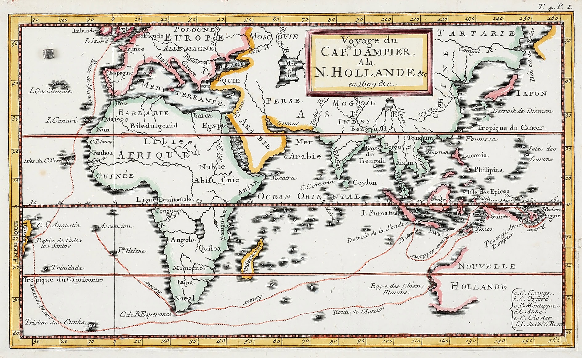 Scarce c.18th hand coloured engraved map showing the tracks of William Dampier’s voyage in the Roebuck expedition of 1699, by the eminent English cartographer Herman Moll.
