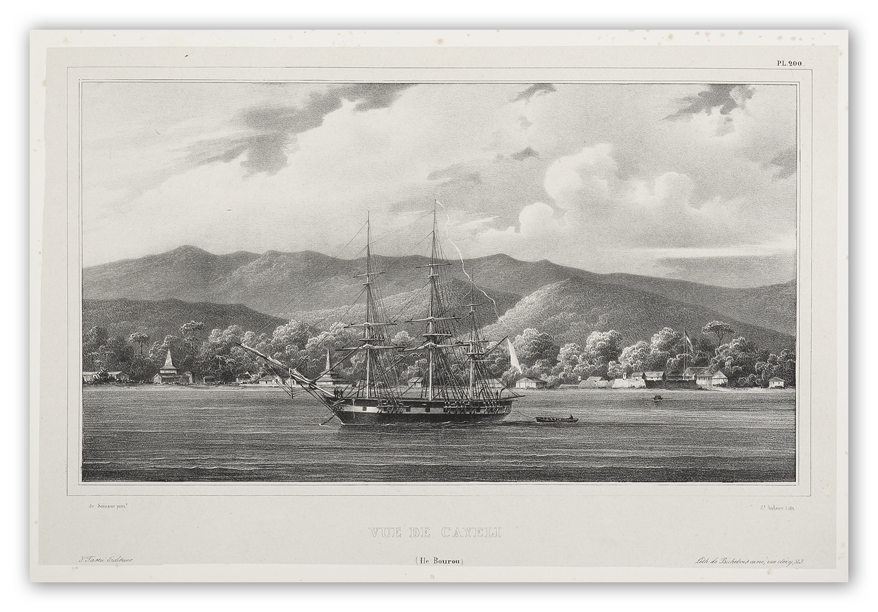 First edition of this superb Chine-collé lithograph on India paper of the Astrolabe at Buru the third largest island within the Maluku Island group, Indonesia.
