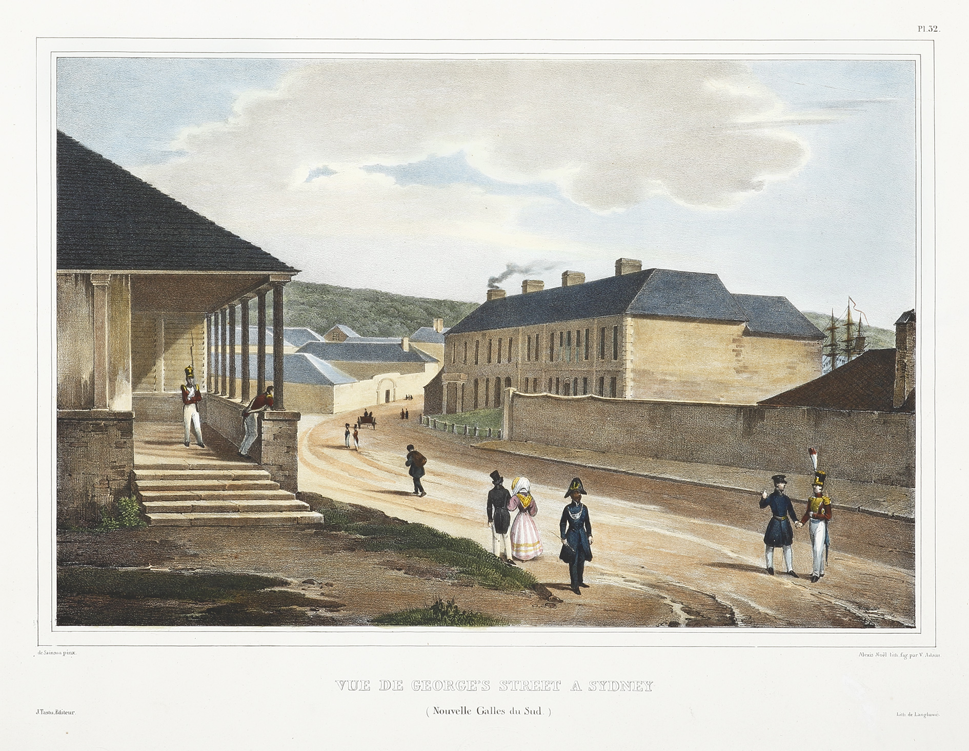 Early c.19th French lithographic view of George Street, Sydney, looking northeast by Louis Sainson, artist on Dumont D’Urville’s voyage of exploration.