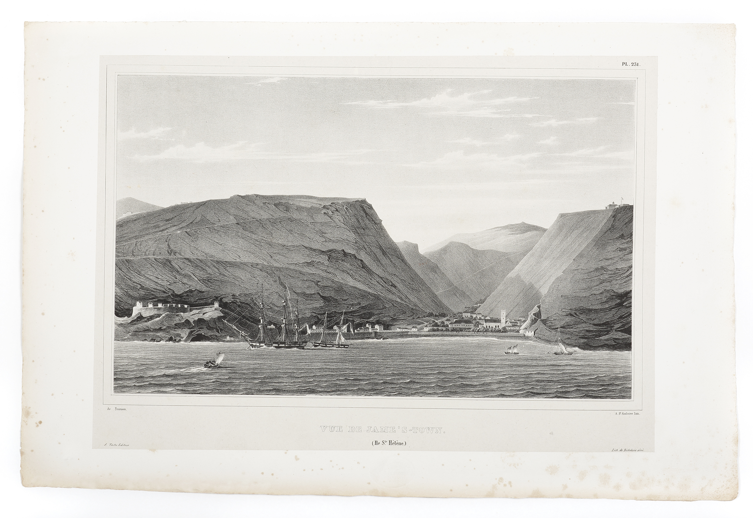First edition of this superb Chine-collé lithograph on India paper of Jamestown, Saint Helena by Louis de Sainson artist aboard the famous Dumont D’Urville voyage of scientific discovery and exploration.