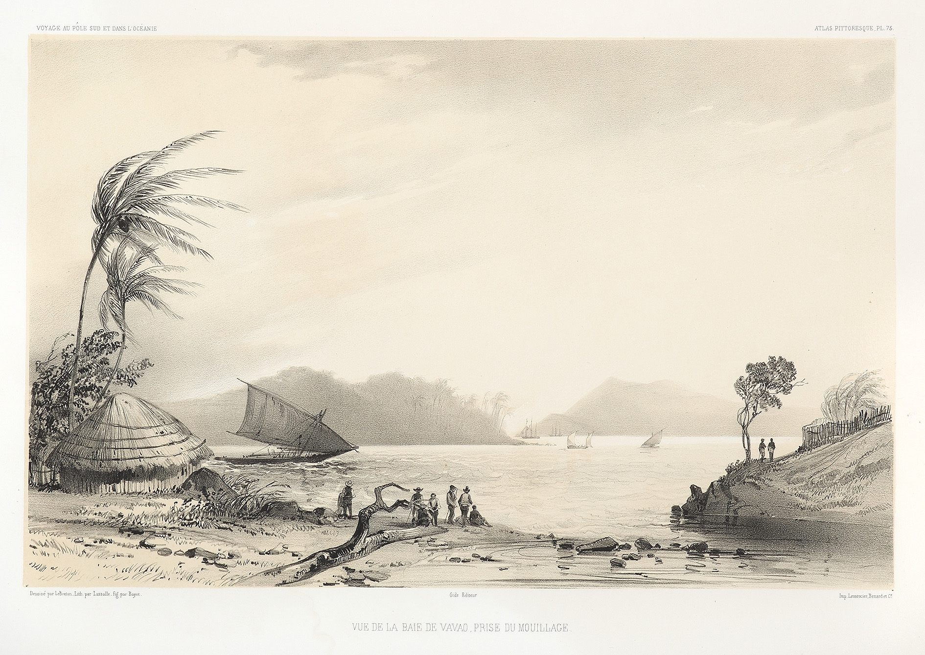 Superb c.19th lithograph of the harbour of Vavaʻu one of the Tongan islands. Dumont D’Urville’s in the ships, l’Astrolabe and Zélée enroute from Samoa in October 1838 stayed for a week at Vava’u Island.