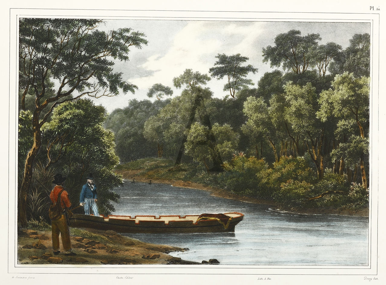 Scarce c.19th hand coloured lithograph of present day Kalgan, Western Australia by Louis de Sainson, artist aboard the famous Dumon’t D’Urville voyage of scientific discovery and exploration.