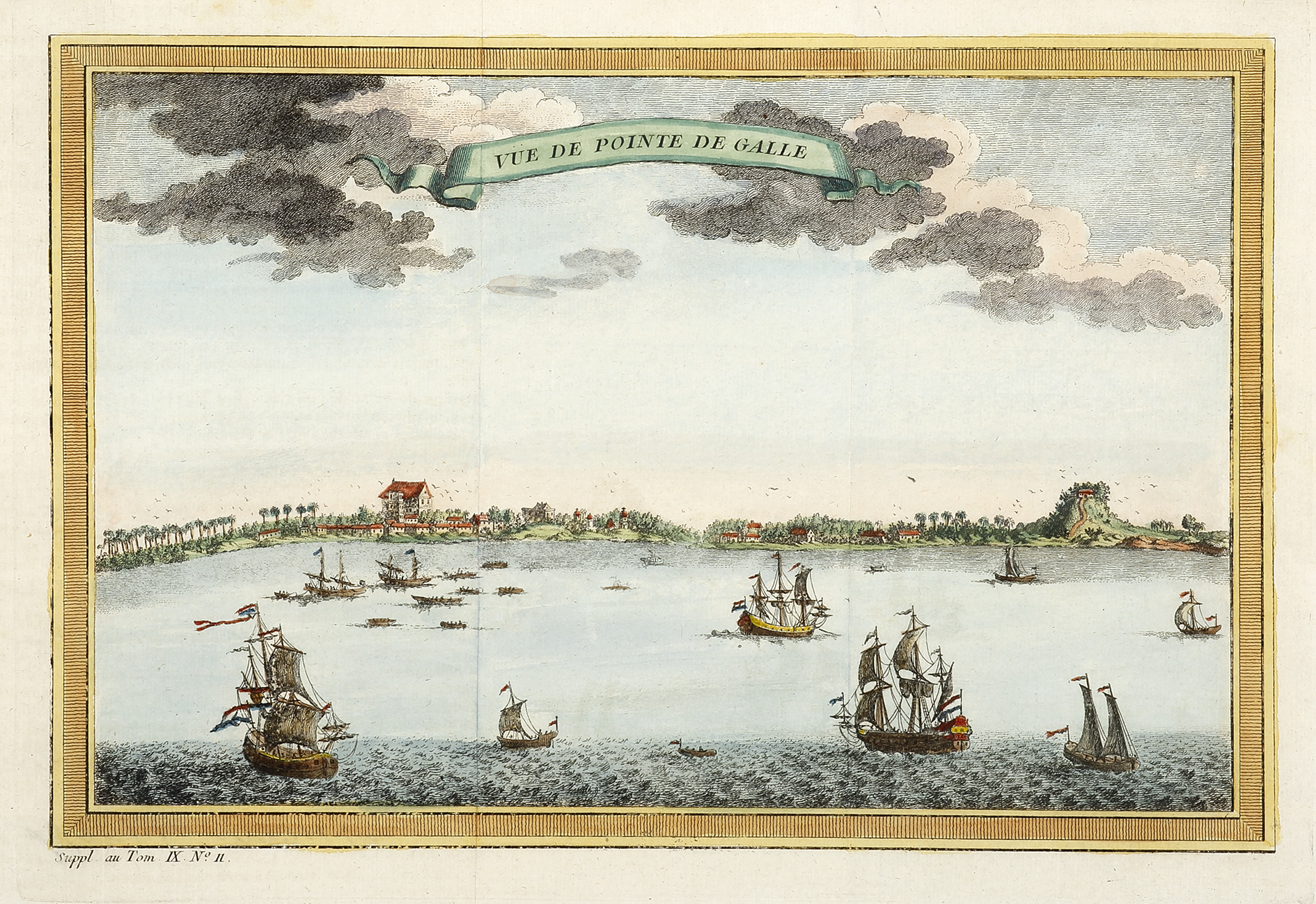 C.18th French engraved view of the Dutch trading walled town of Galle, on Sri Lanka’s south west coast. The Dutch built the fort in 1663 using fortified solid granite walls and three bastions, known as “Sun”, “Moon” and “Star”. After the British took over the country from the Dutch in 1796, the British preserved the fort unchanged and used it as the administrative centre of the district.