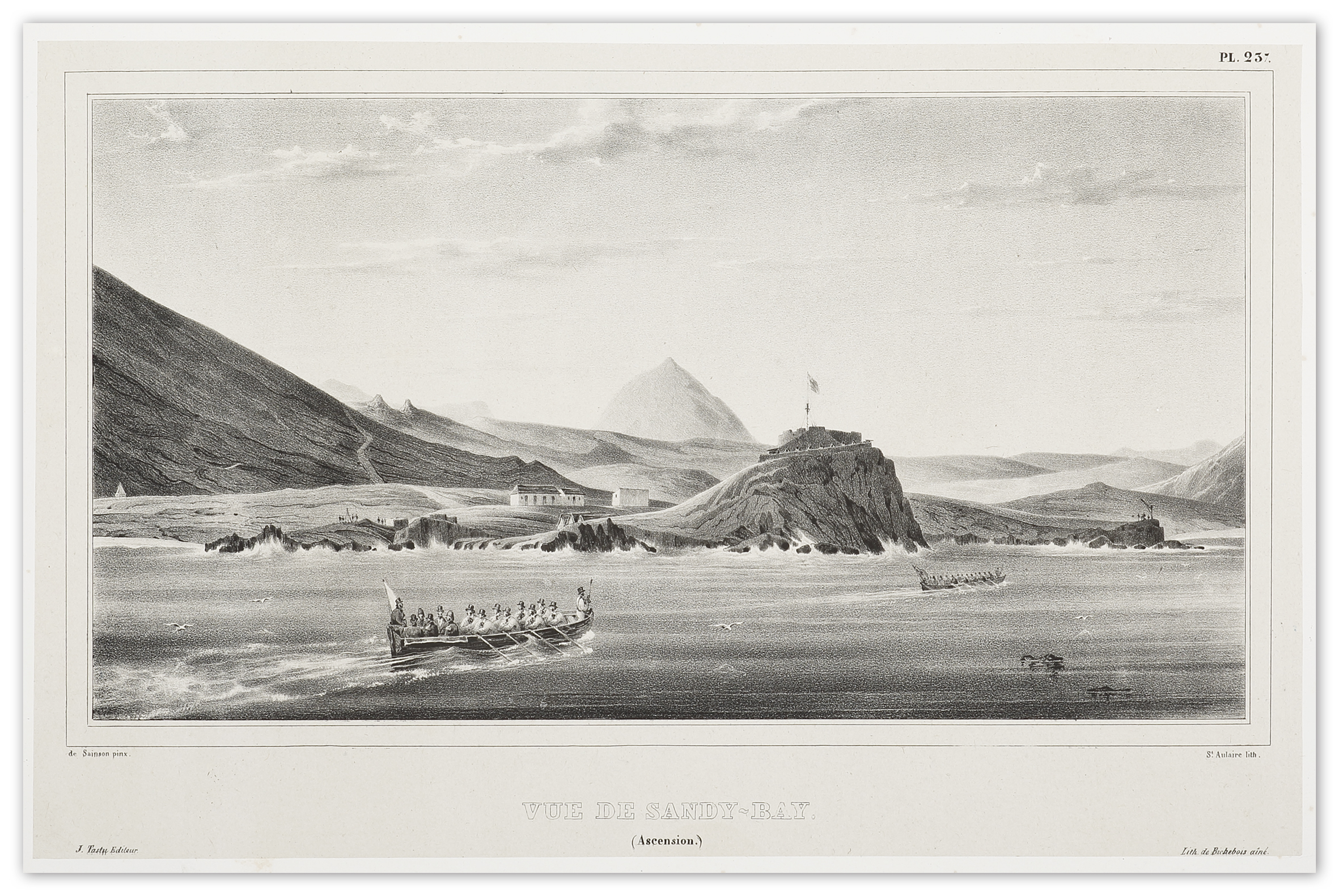 First edition of this superb Chine-collé lithograph on India paper of Ascension Island by Louis de Sainson artist aboard the famous Dumon’t D’Urville voyage of scientific discovery and exploration.