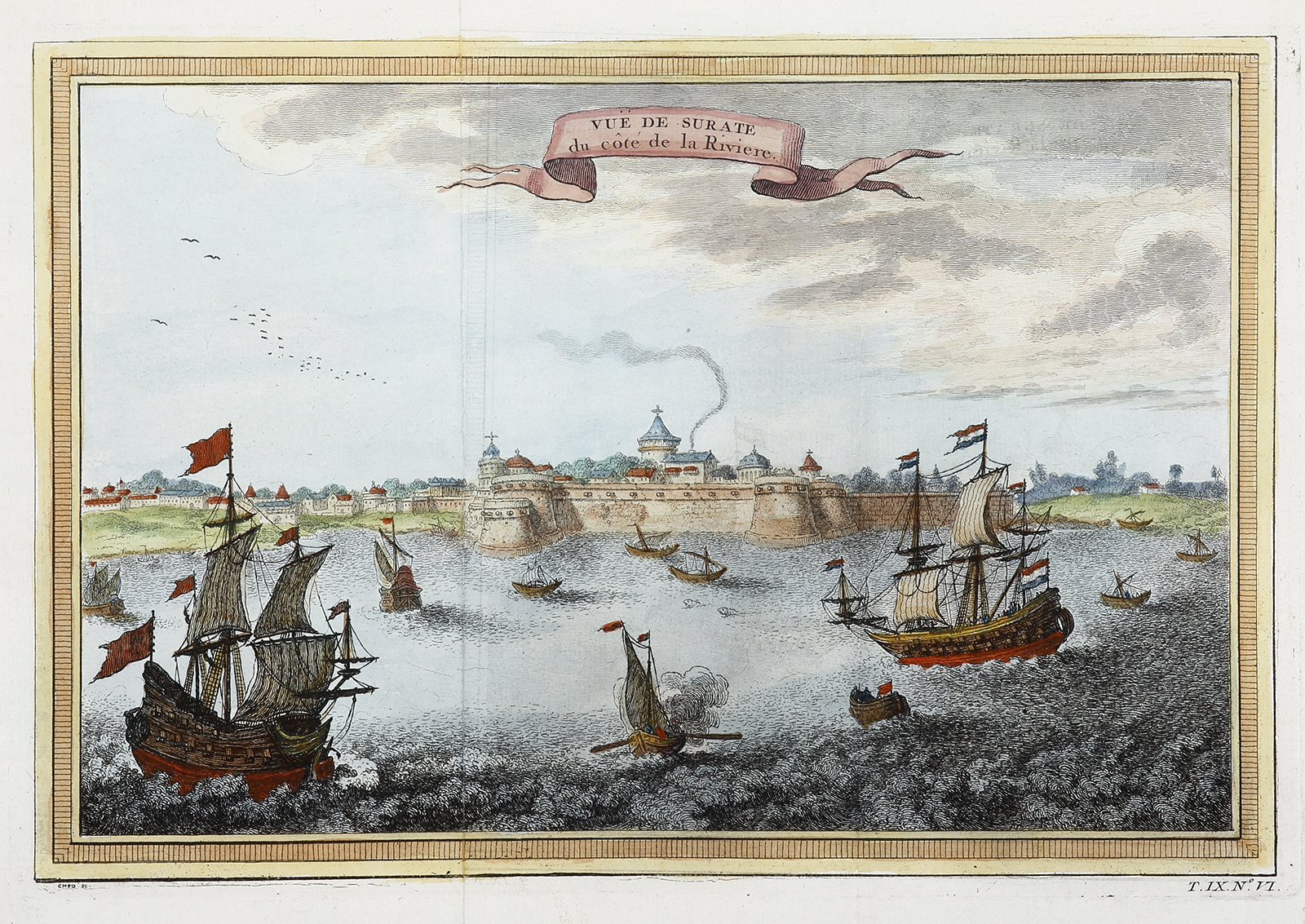 C.18th French engraving of Surat which is situated on a bend in the river Tapti.