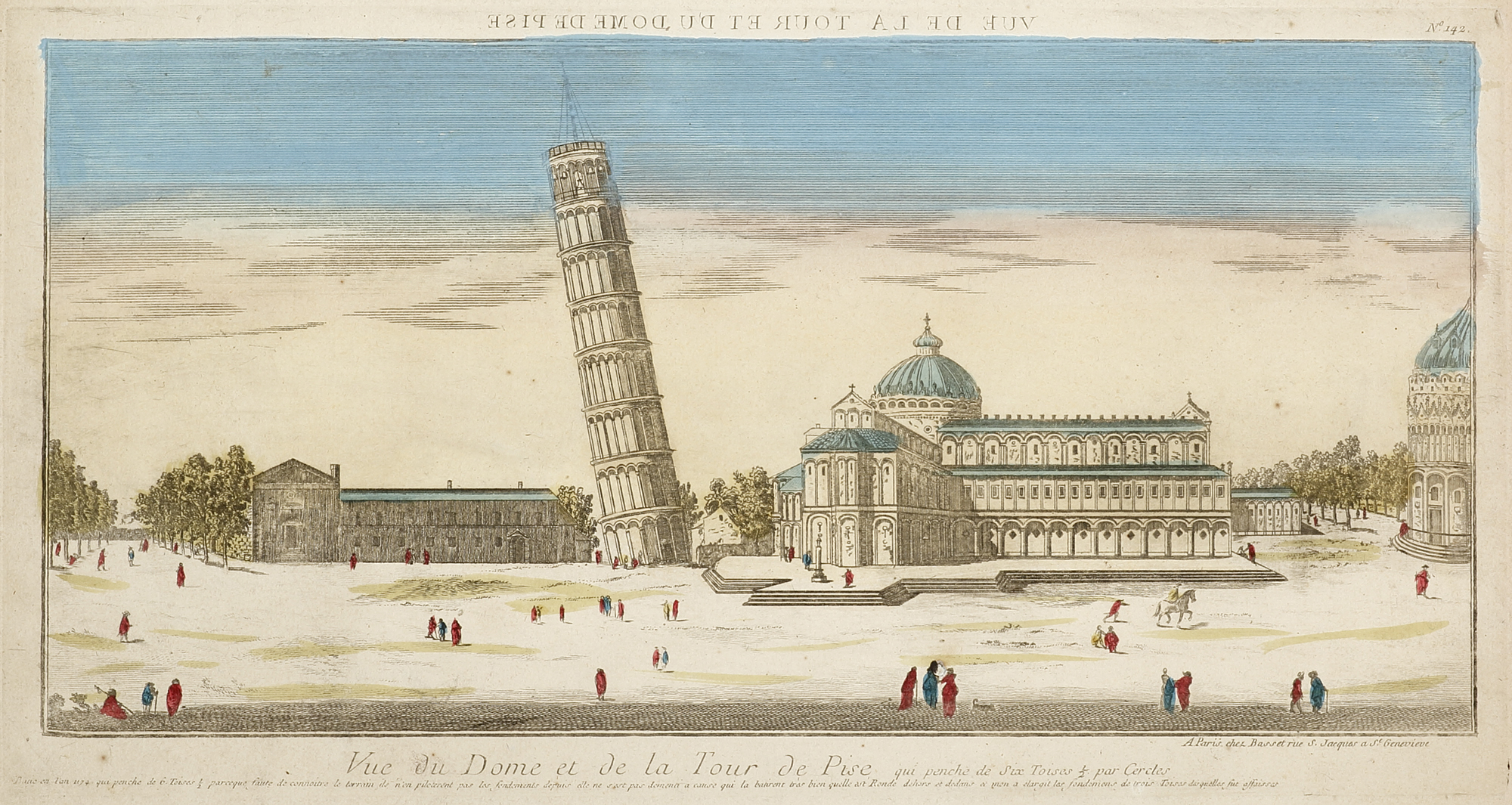 Fine c.18th vue Optic of the famous Leaning Tower of Pisa. Construction of the tower occurred in three stages over 199 years with construction beginning on 9 August 1173.