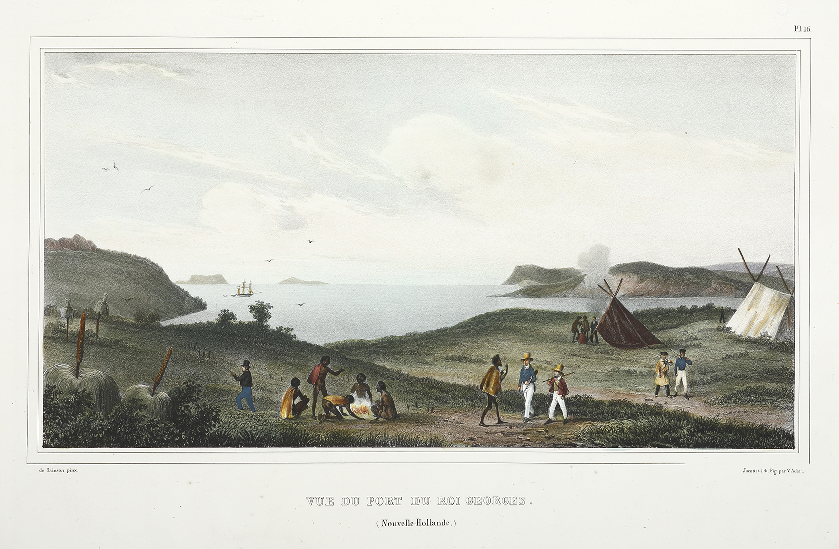 French artist on the voyage of exploration on board the Astrolabe under the command of Dumont D’Urville which explored and visited the Pacific, Asia, New Zealand and Australia. He began his naval career at the port of Rochefort, working there from 21 August 1825 until 6 January 1826, where he joined the Astrolabe as a draughtsman. The Astrolabe visited Australia from October to December 1826 and De Sainson made a number of drawings of King George Sound (WA), Westernport VIC), and Jervis Bay NSW and Sydney). On the Astrolable’s return to Australian waters during December 1827 to early January 1828 the Astrolabe anchored at Hobart Town where de Sainson made a number of important drawings of Hobart and its environs. On his return to France de Sainson was part of the editorial group that made the official account Historical Atlas of the expedition ready or publication. In November 1829, at Dumont d’Urville’s request, de Sainson was promoted commis de marine 3e classe. He became a Chevalier de la Légion d’Honneurin August 1831 and a commis de 2e classe in September 1833. Further biographical information is not available after this time.