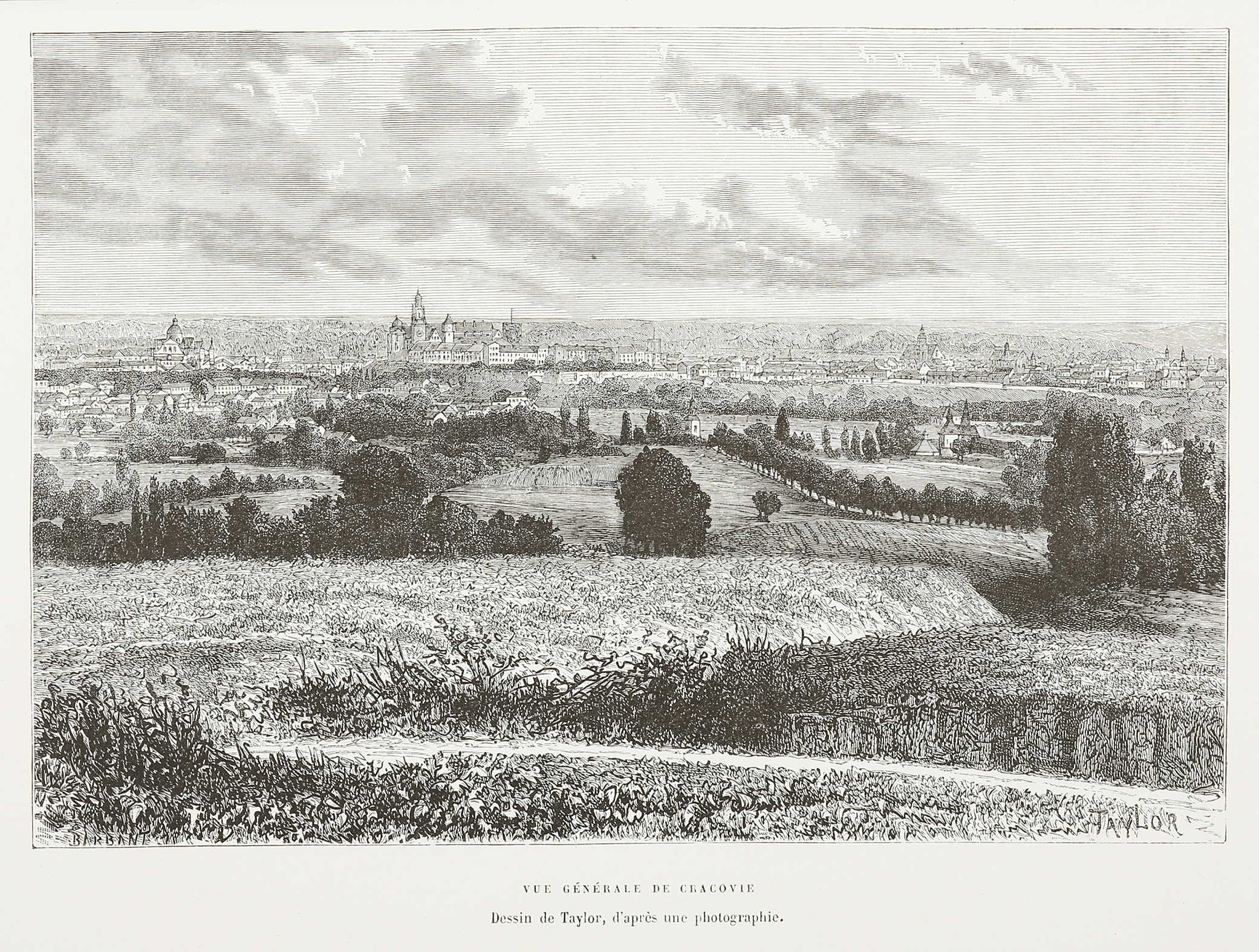 Early distant view of Krakow, Poland, drawn by Taylor from an original photograph.