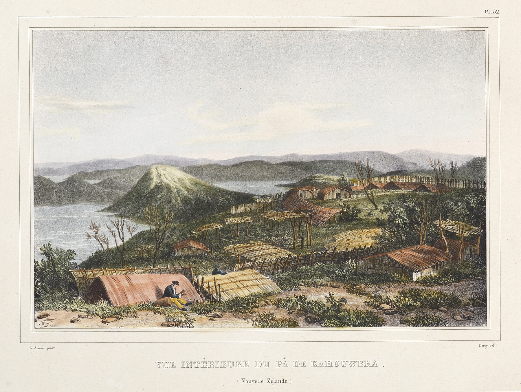 Scarce lithograph of the eastern headland of Paroa Bay, Bay of Islands by Louis de Sainson, artist on the Dumont D’Urville expedition. D’Urville had sailed from Port Jackson on 19.12.26 and sighted the south coast of New Zealand on 10th January … Read Full Description